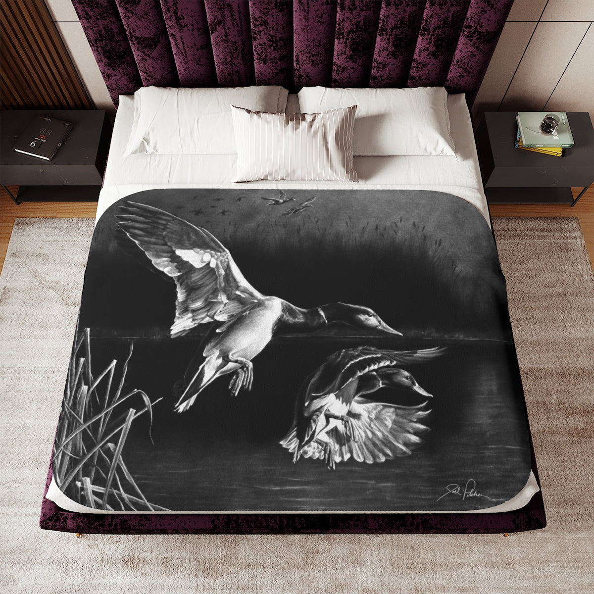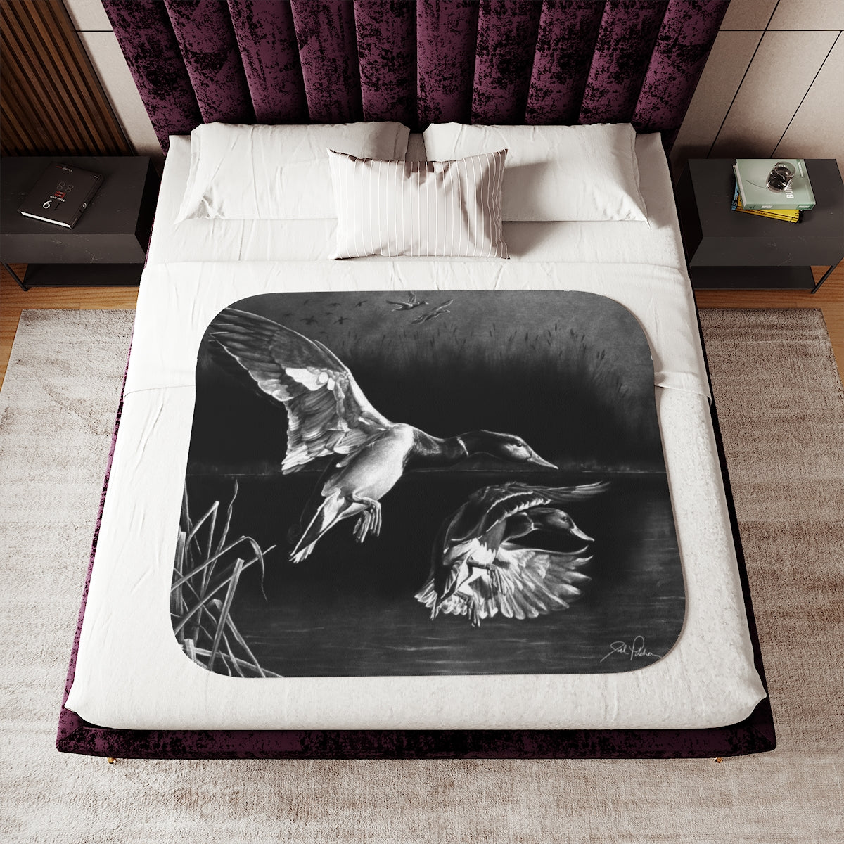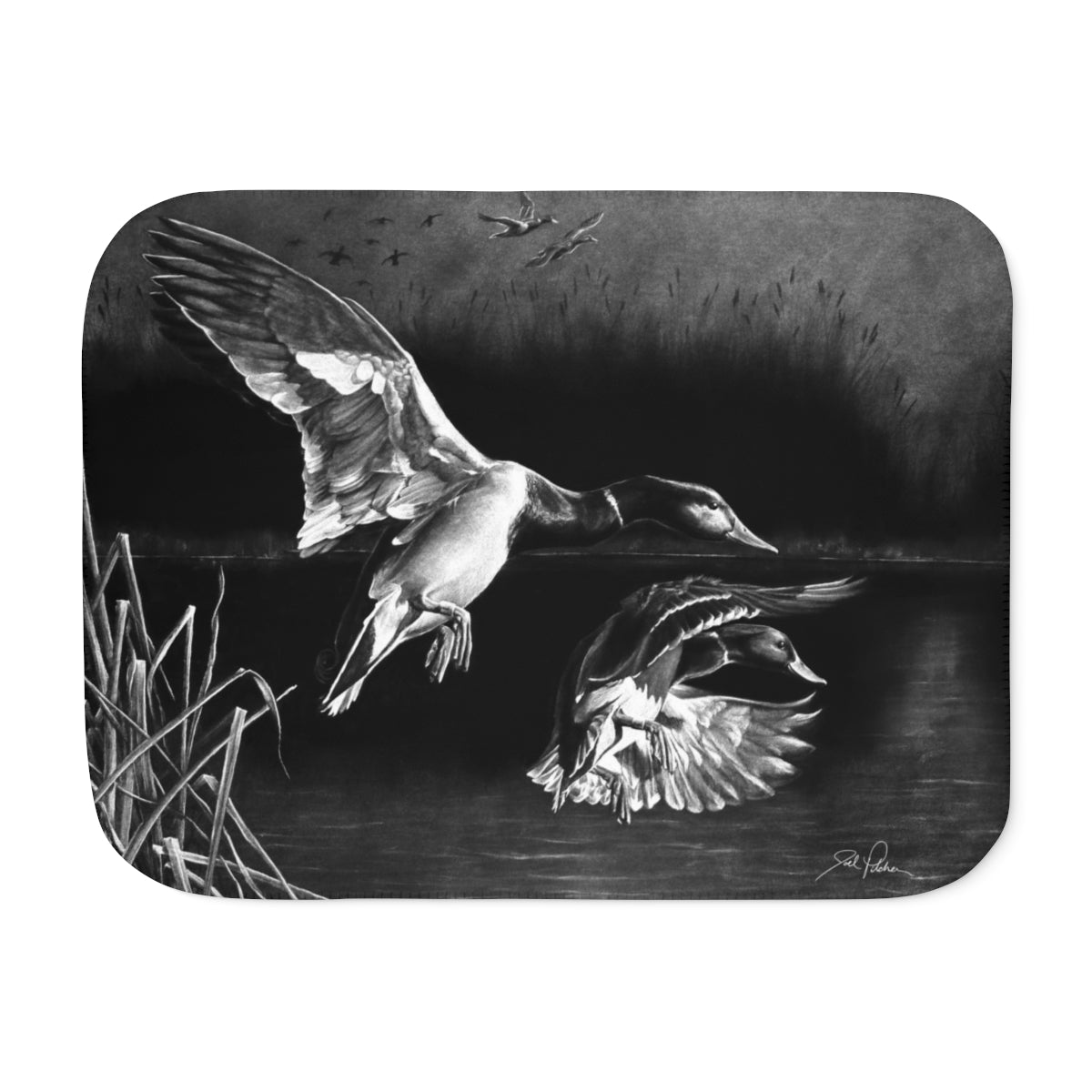 This snuggly sherpa blanket comes in beige or grey colors and features artwork by Joel Pilcher. Made with a supremely soft polyester front and a sherpa back, it's available in 3 sizes.