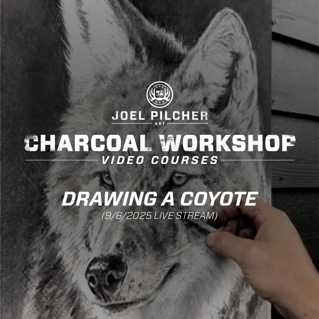Watch as Joel demonstrates and describes in detail his methods and techniques for drawing a coyote using charcoal on canvas.