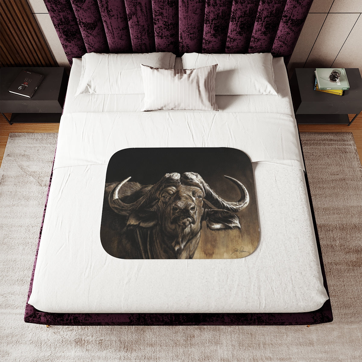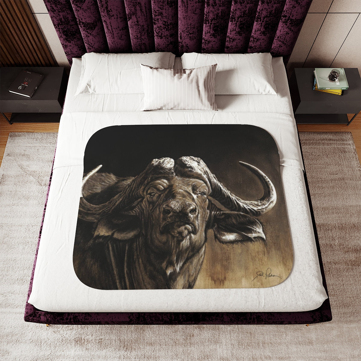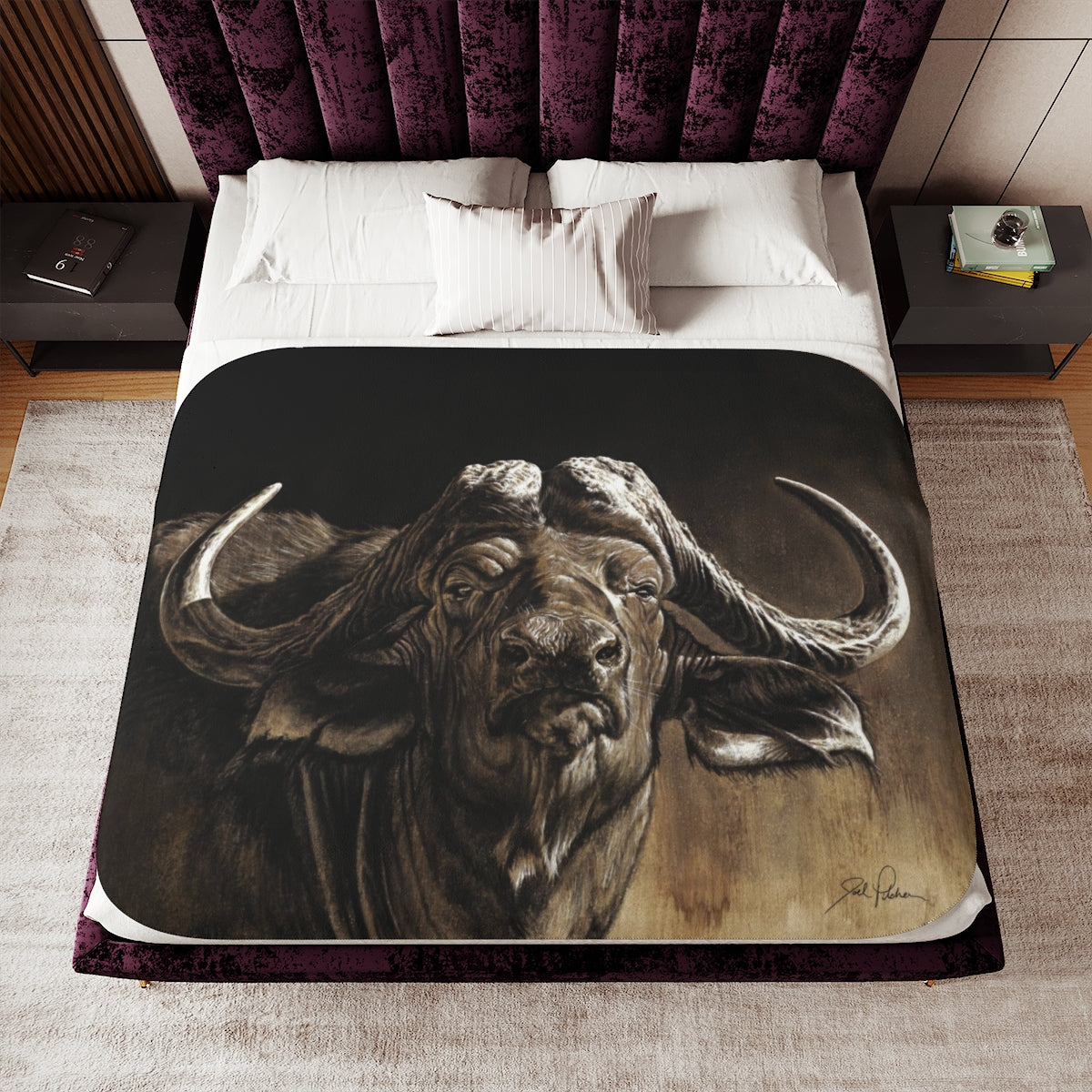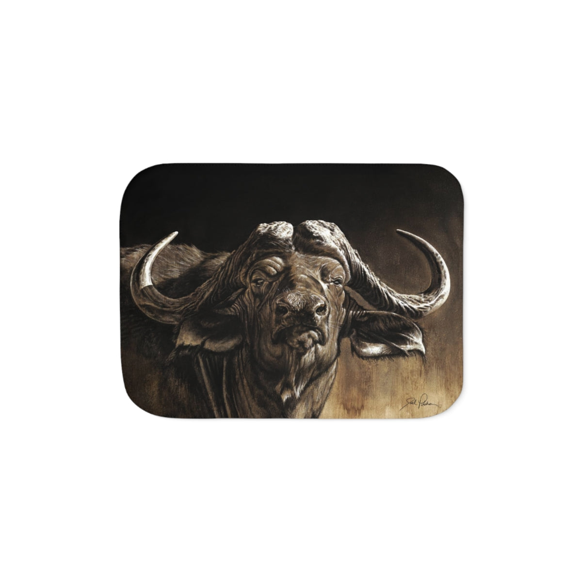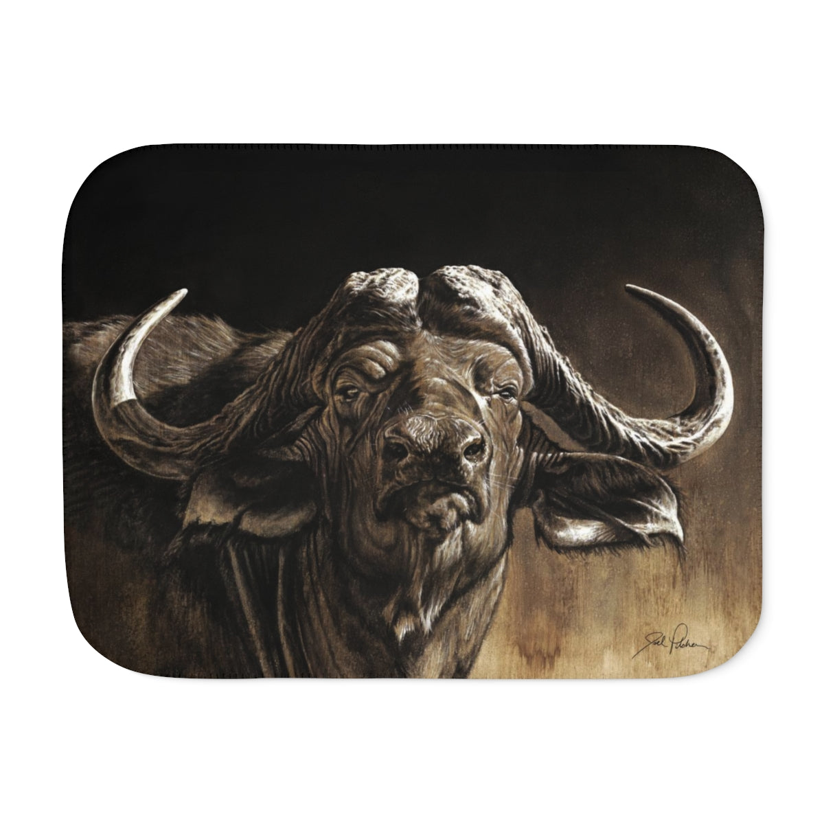 This snuggly sherpa blanket comes in beige or grey colors and features artwork by Joel Pilcher. Made with a supremely soft polyester front and a sherpa back, it's available in 3 sizes.