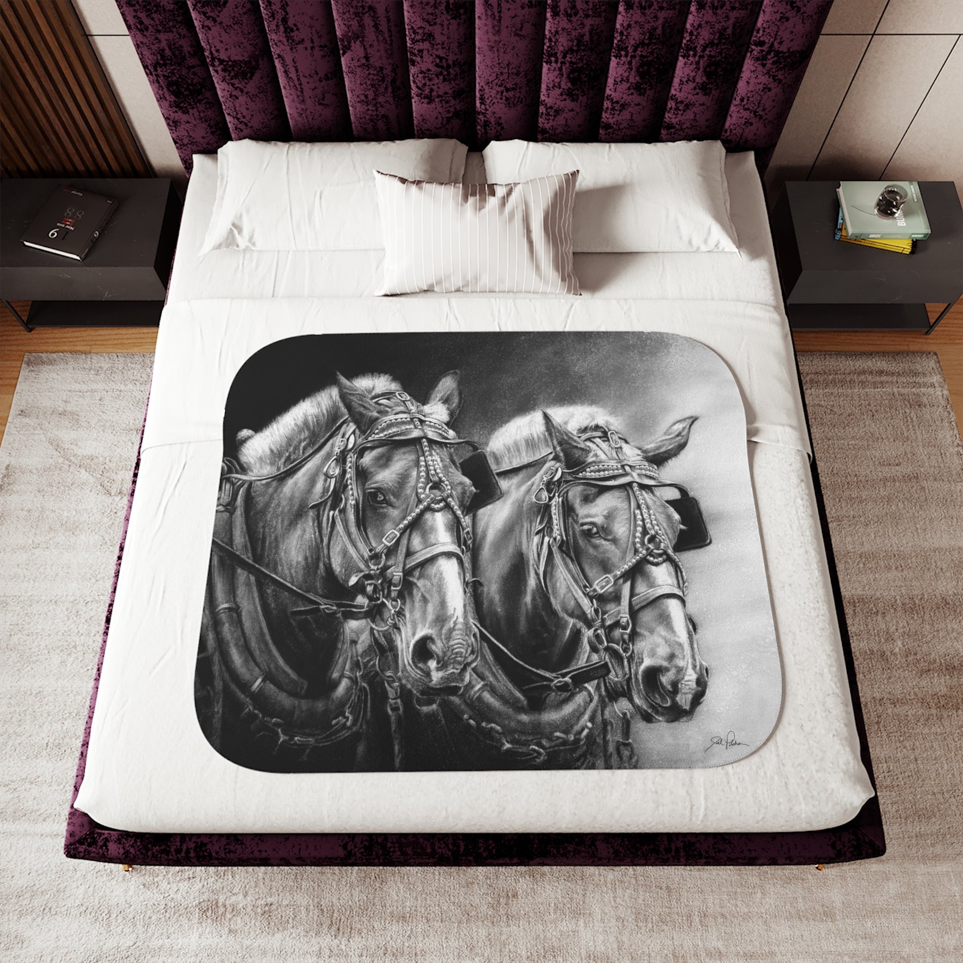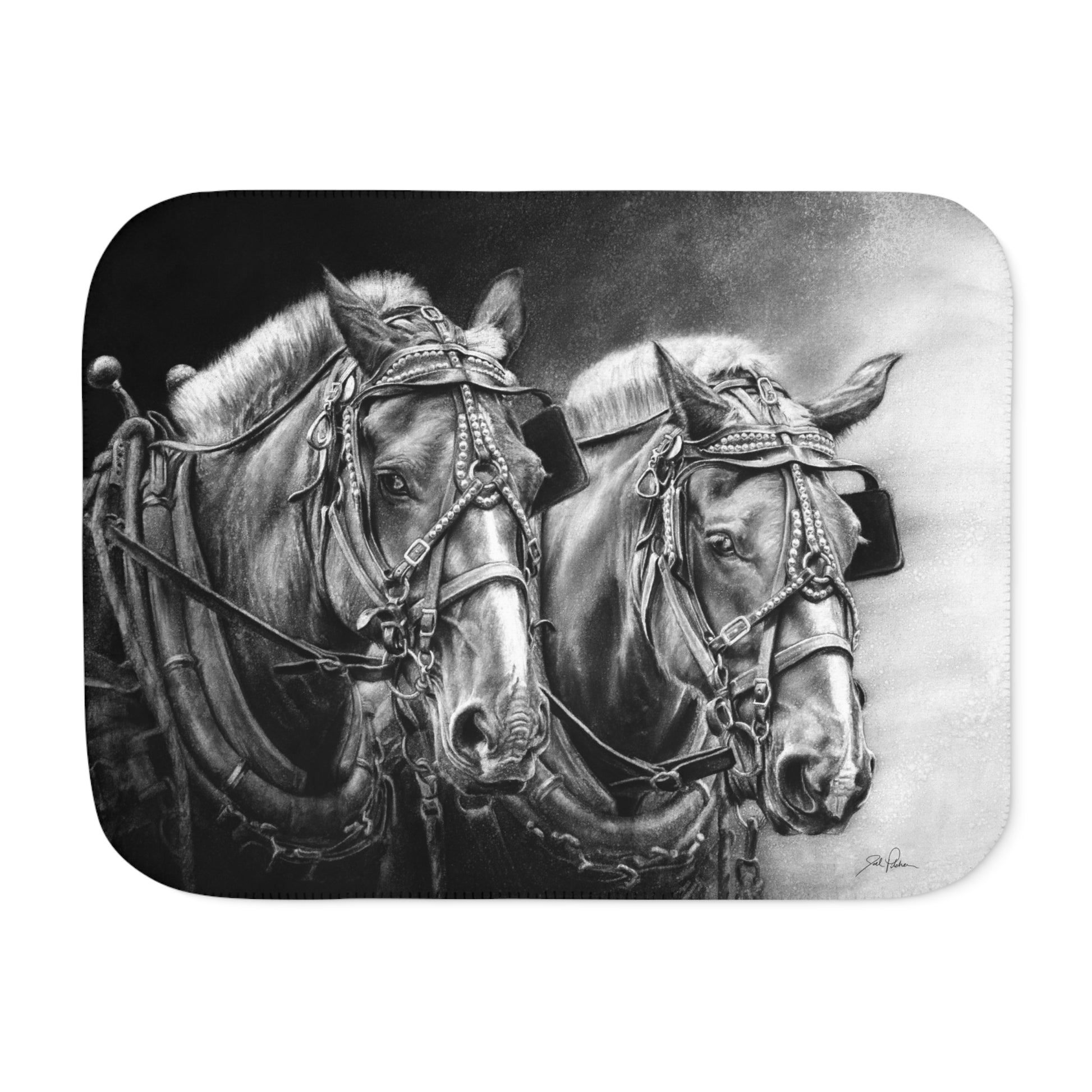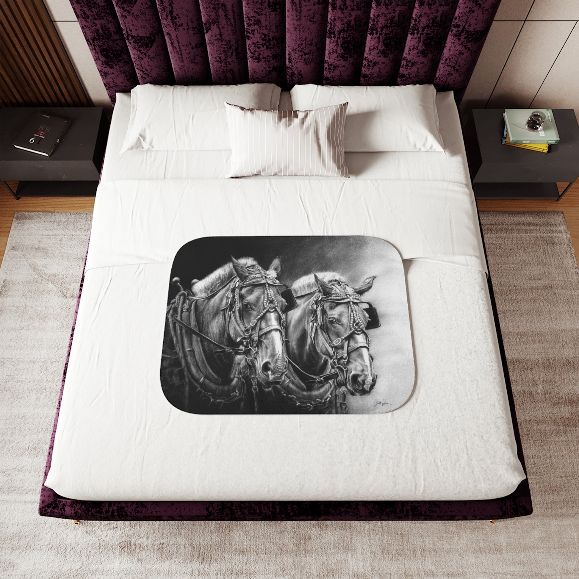 This snuggly sherpa blanket comes in beige or grey colors and features artwork by Joel Pilcher. Made with a supremely soft polyester front and a sherpa back, it's available in 3 sizes.