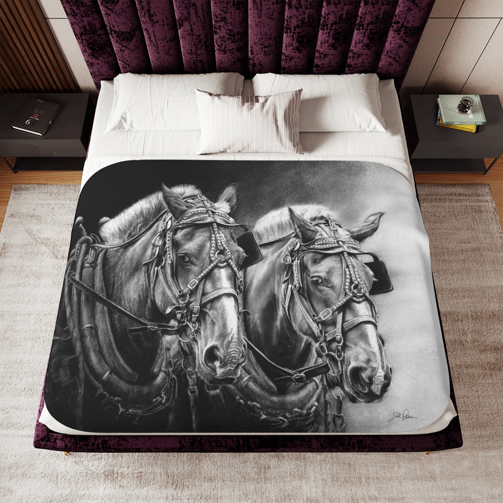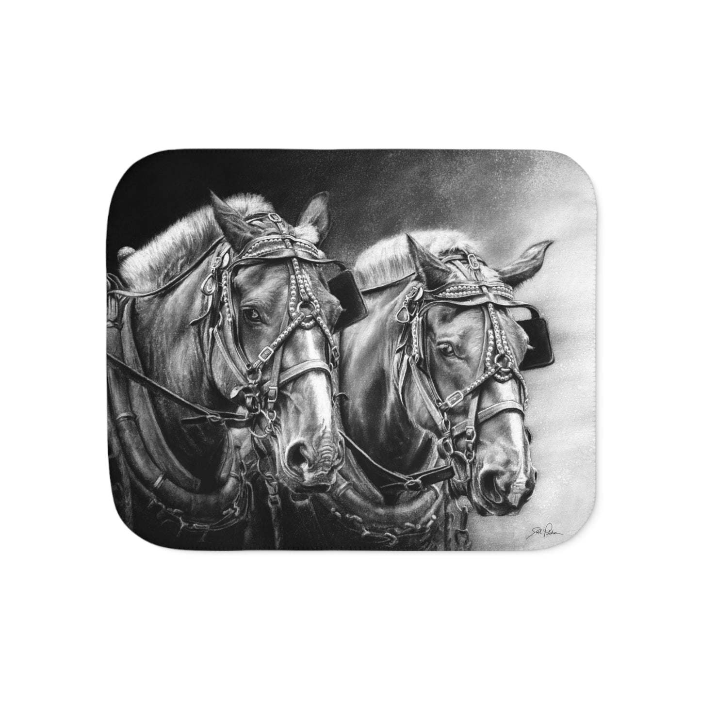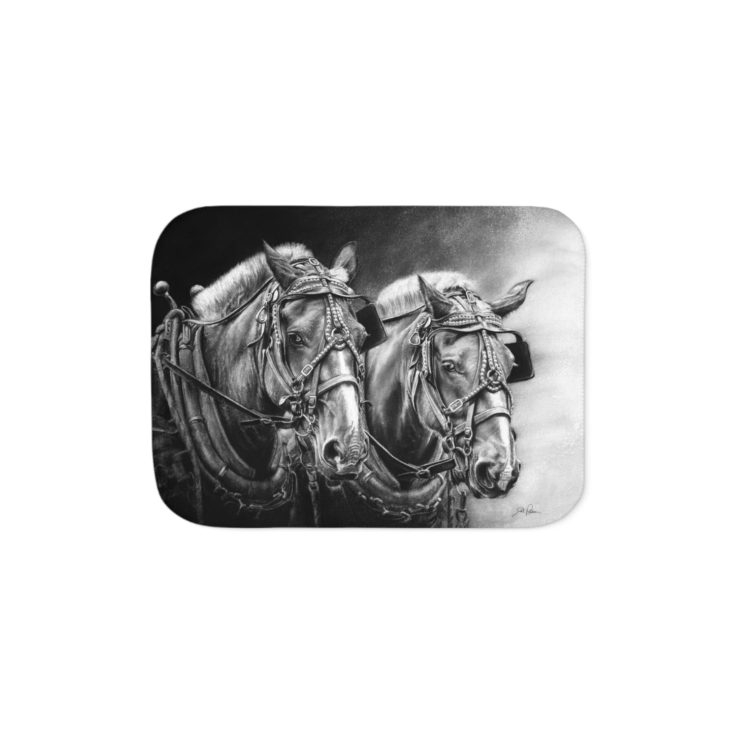 This snuggly sherpa blanket comes in beige or grey colors and features artwork by Joel Pilcher. Made with a supremely soft polyester front and a sherpa back, it's available in 3 sizes.
