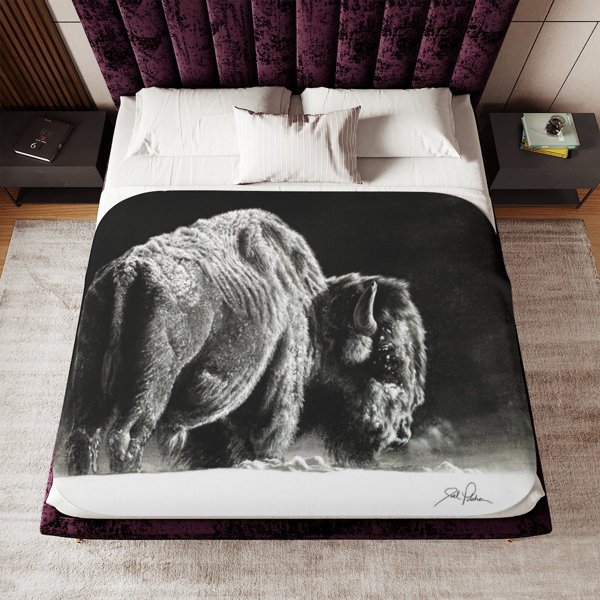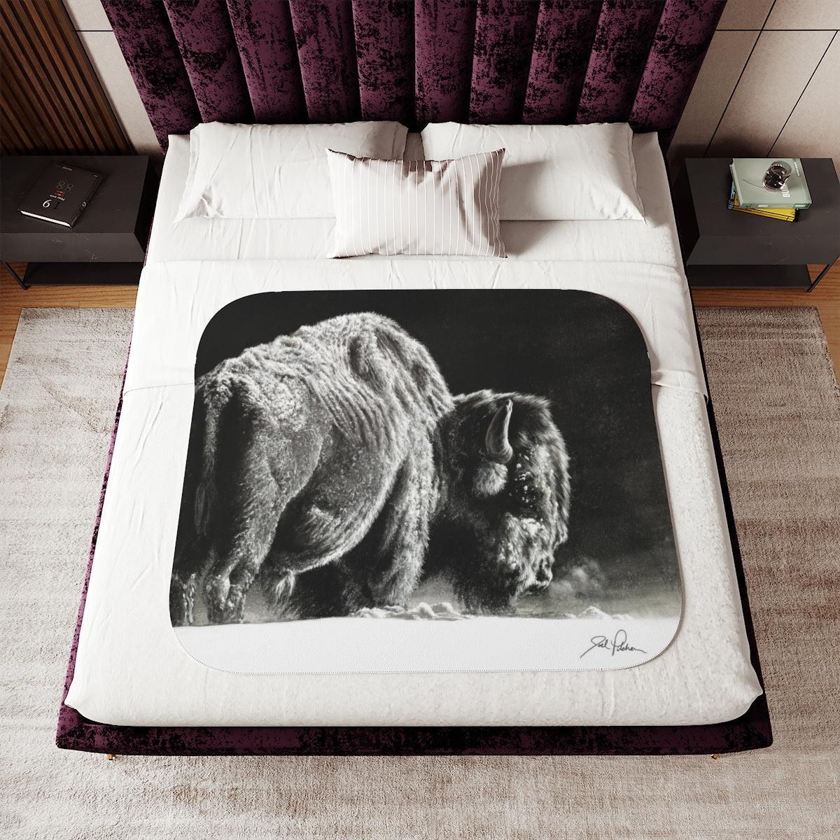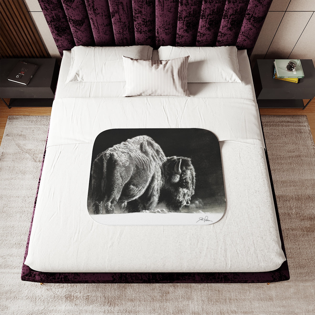 This snuggly sherpa blanket comes in beige or grey colors and features artwork by Joel Pilcher. Made with a supremely soft polyester front and a sherpa back, it's available in 3 sizes.