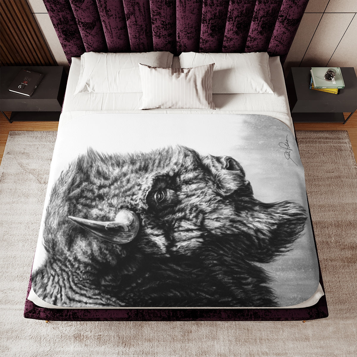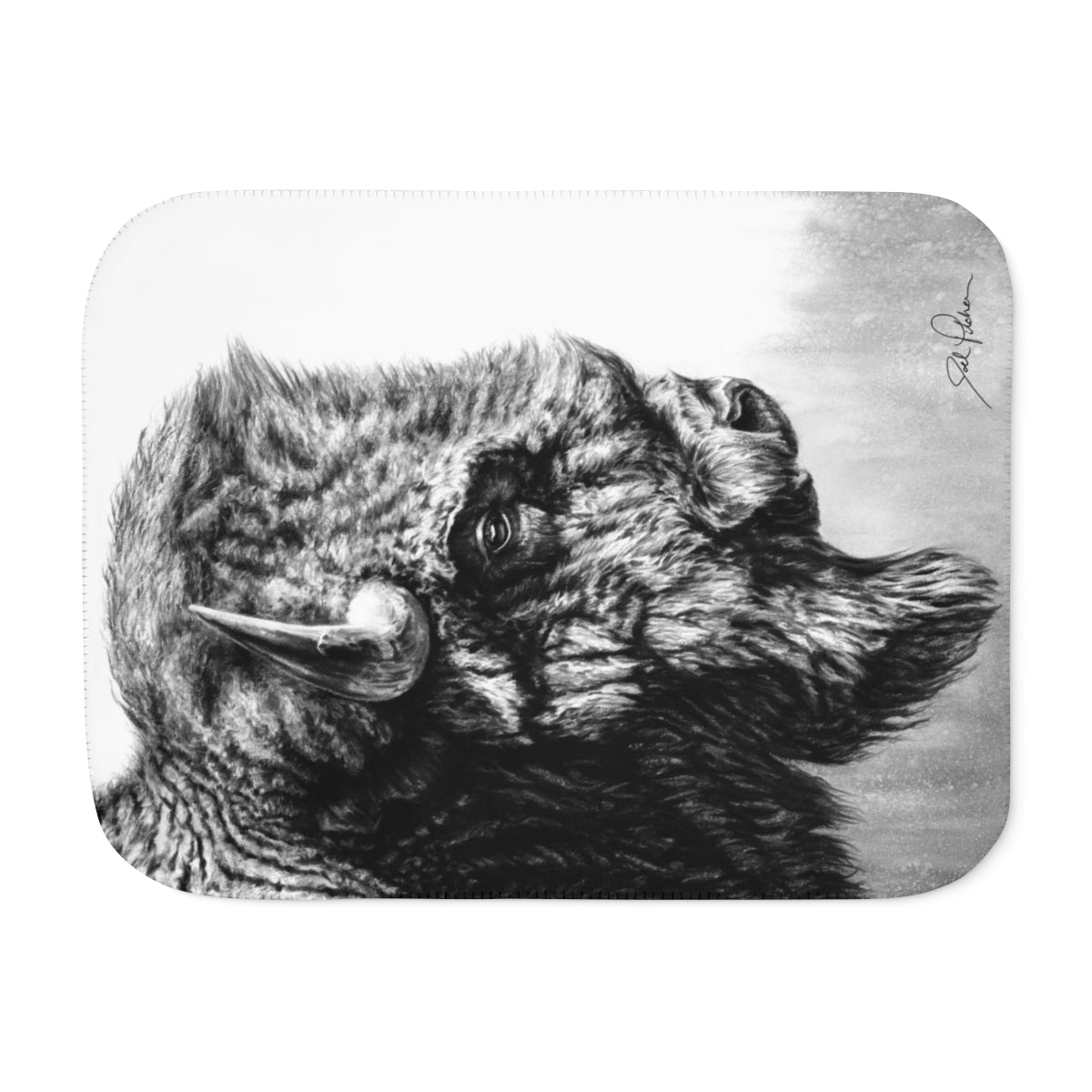 This snuggly sherpa blanket comes in beige or grey colors and features artwork by Joel Pilcher. Made with a supremely soft polyester front and a sherpa back, it's available in 3 sizes.