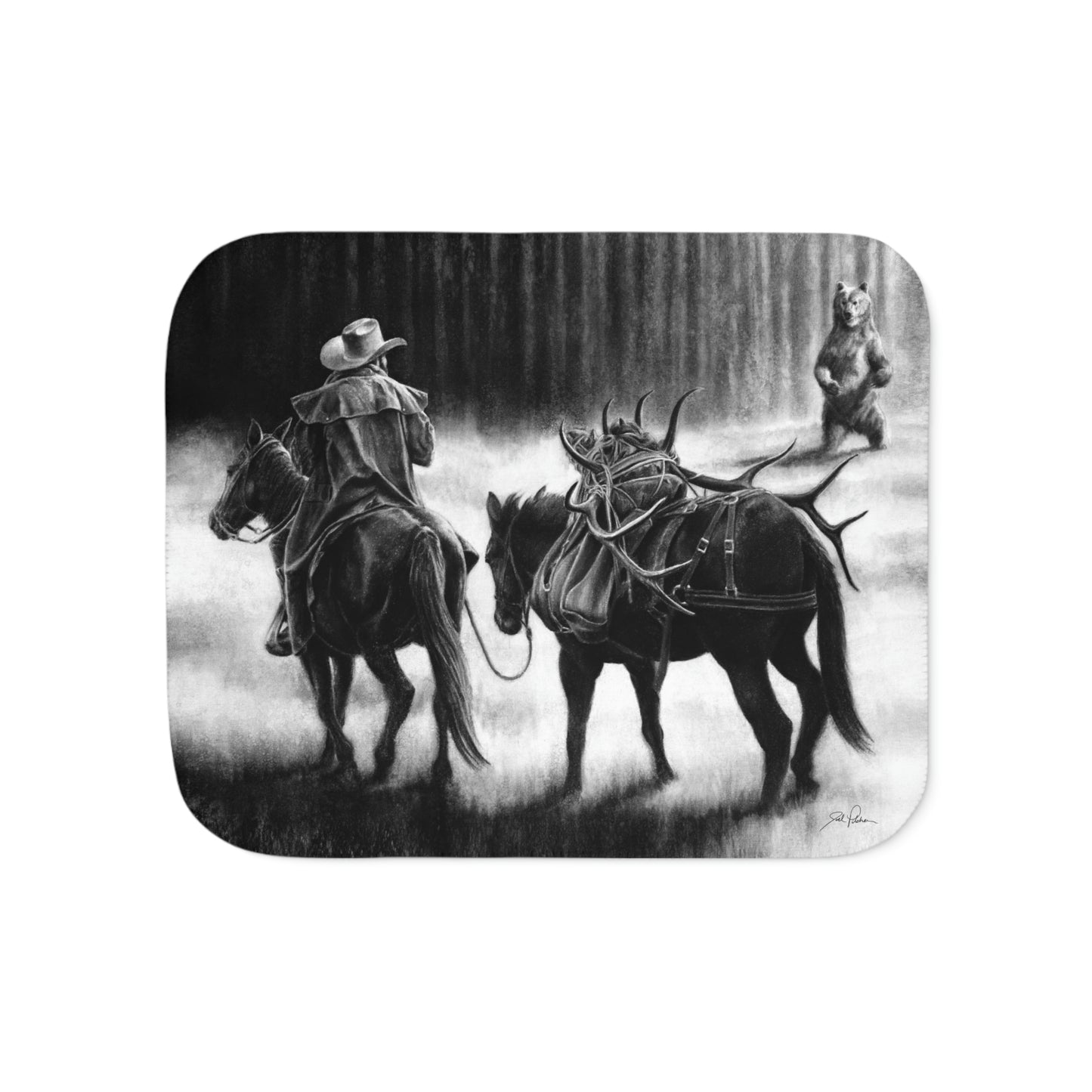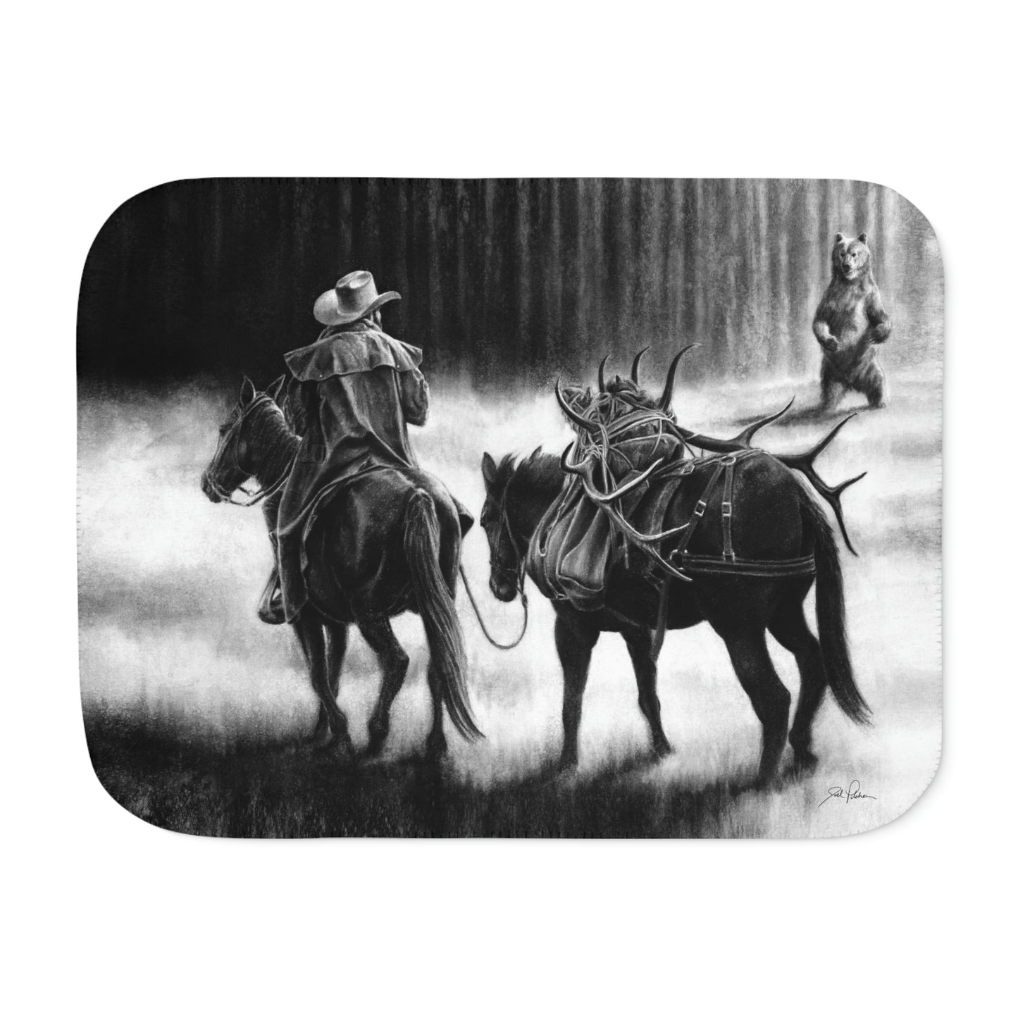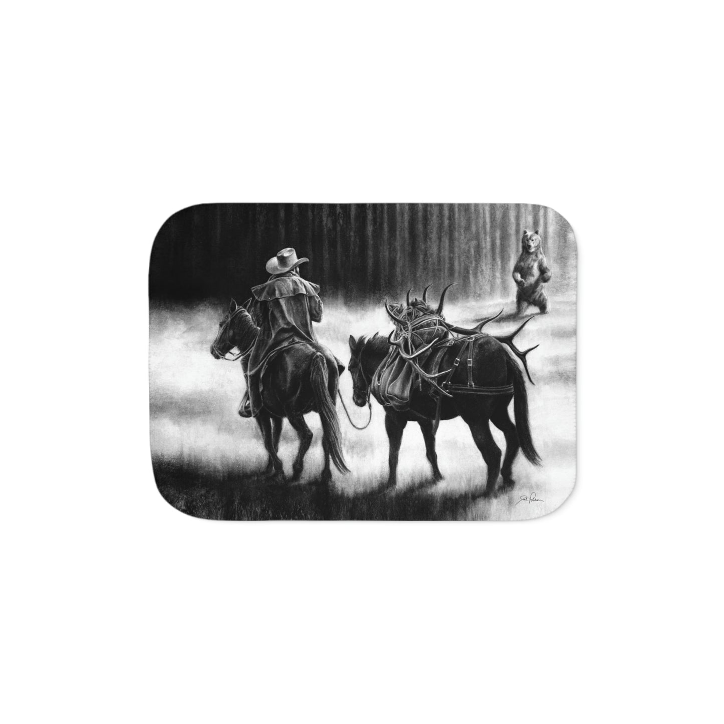 This snuggly sherpa blanket comes in beige or grey colors and features artwork by Joel Pilcher. Made with a supremely soft polyester front and a sherpa back, it's available in 3 sizes.
