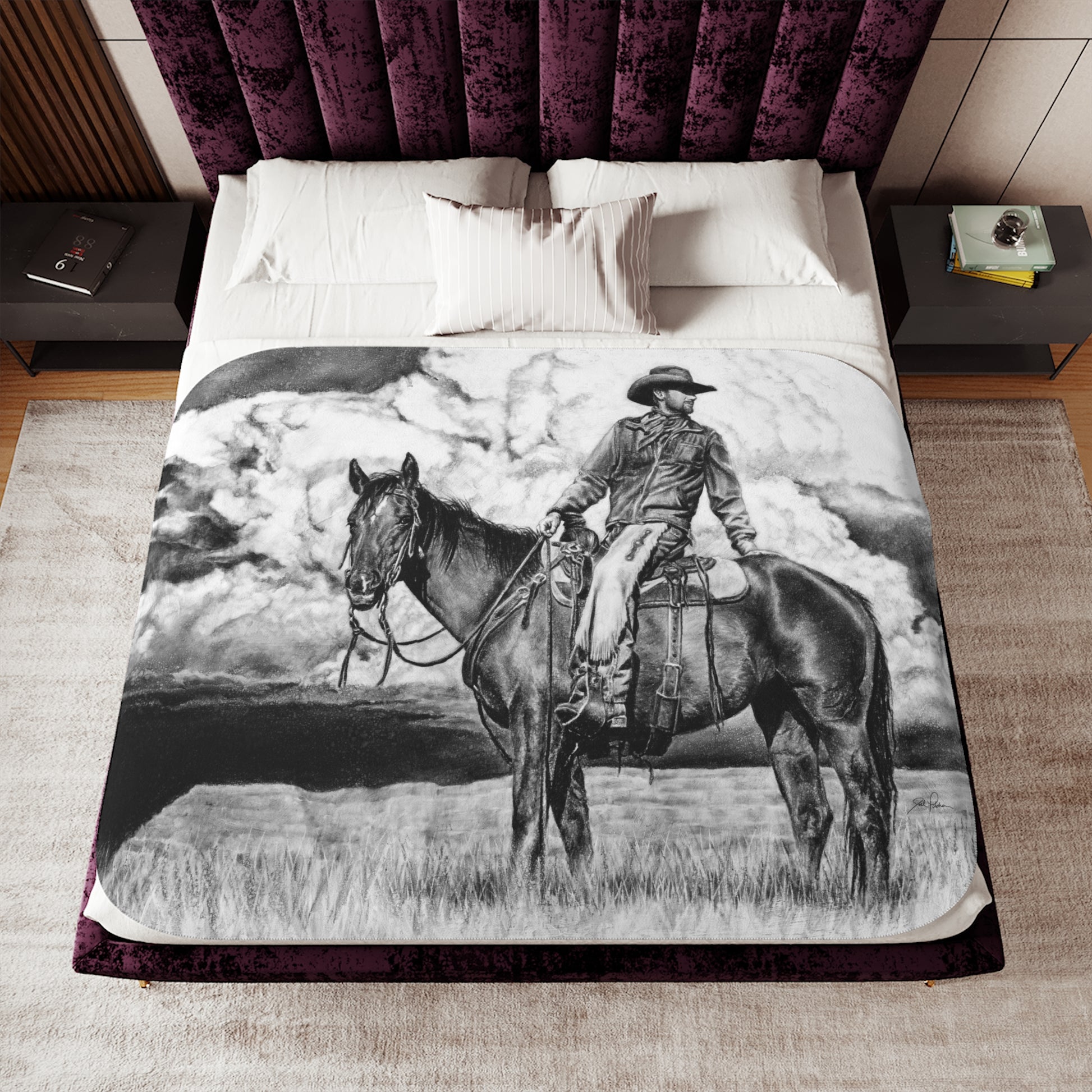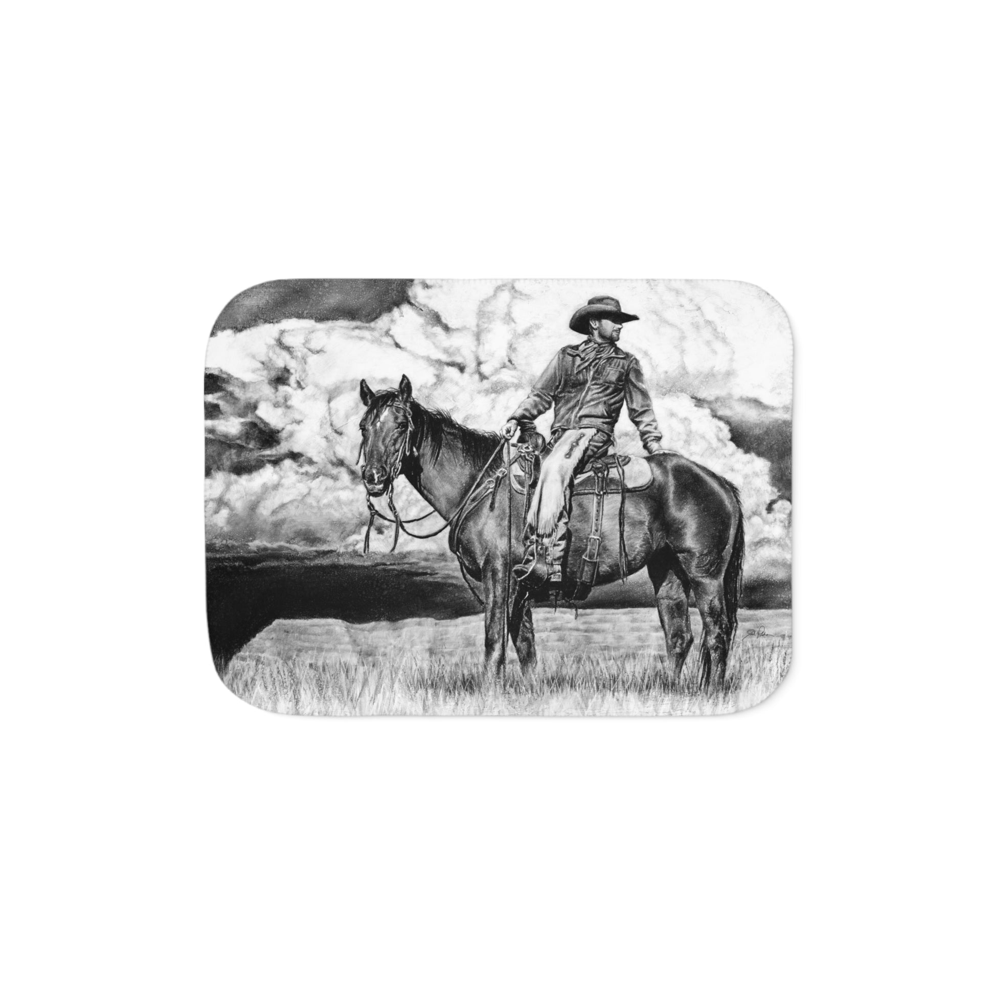 This snuggly sherpa blanket comes in beige or grey colors and features artwork by Joel Pilcher. Made with a supremely soft polyester front and a sherpa back, it's available in 3 sizes.