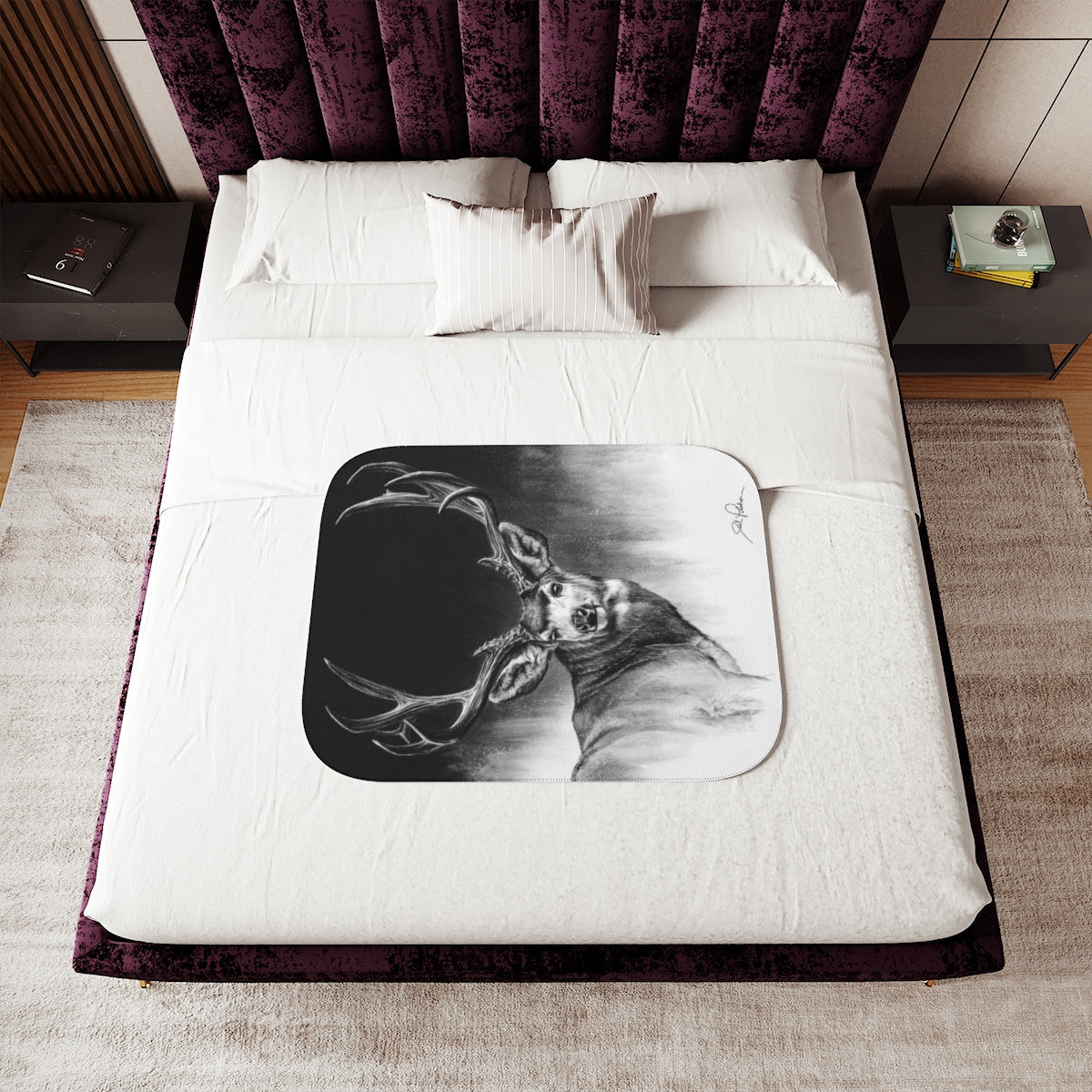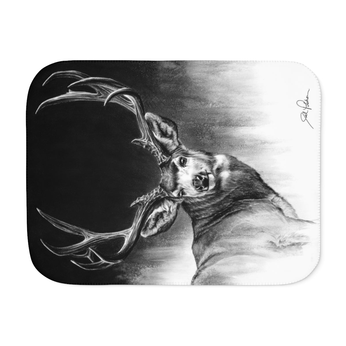 This snuggly sherpa blanket comes in beige or grey colors and features artwork by Joel Pilcher. Made with a supremely soft polyester front and a sherpa back, it's available in 3 sizes.