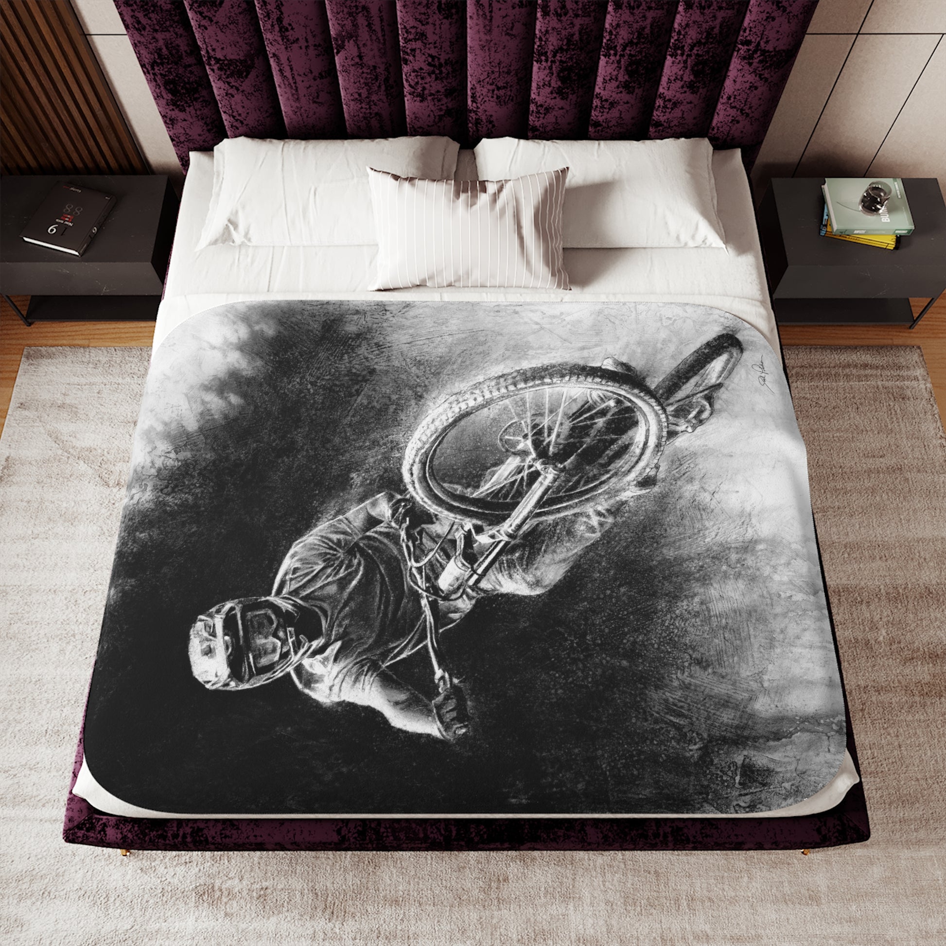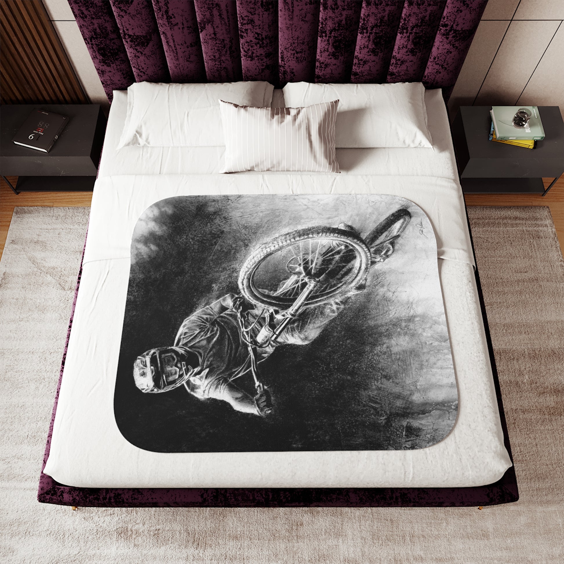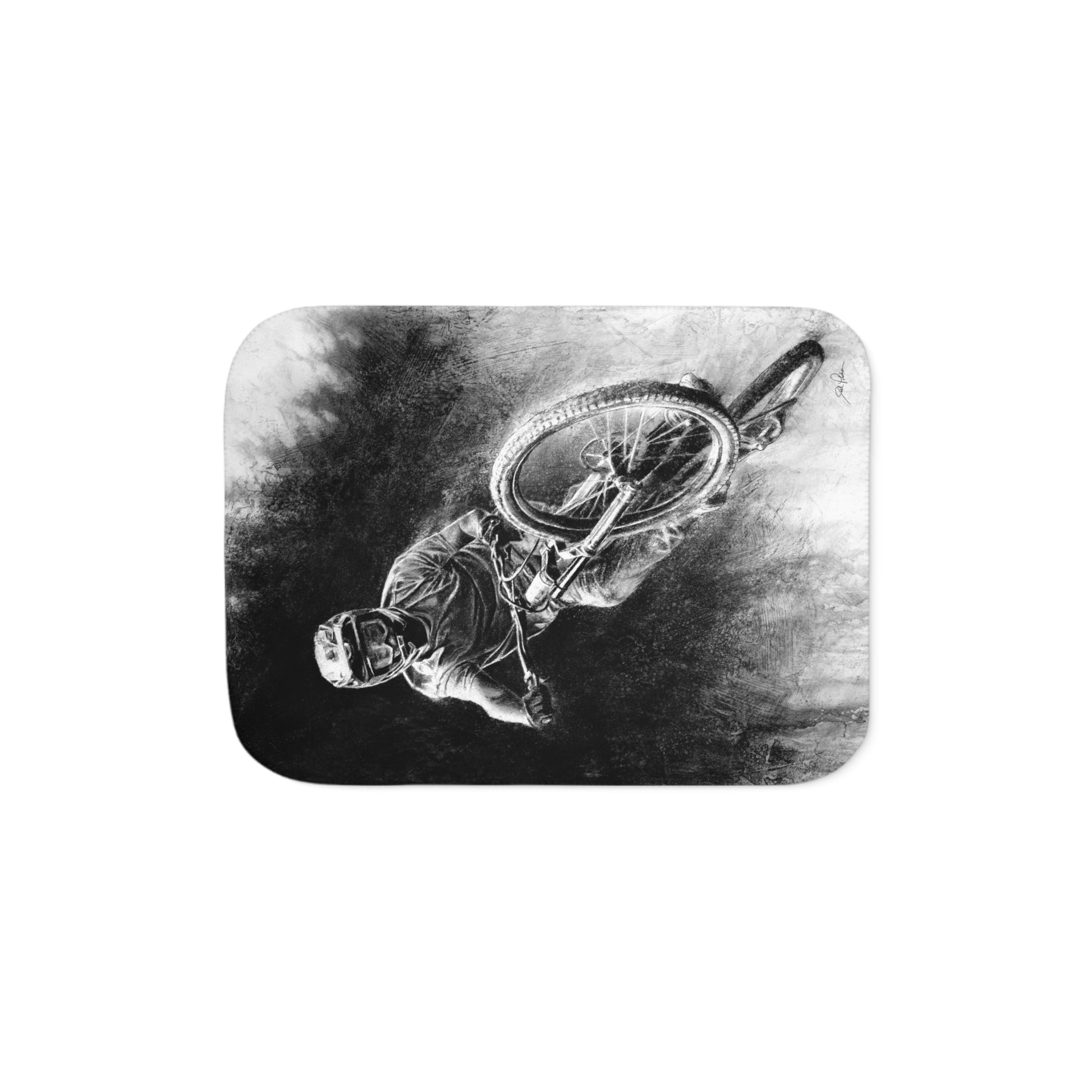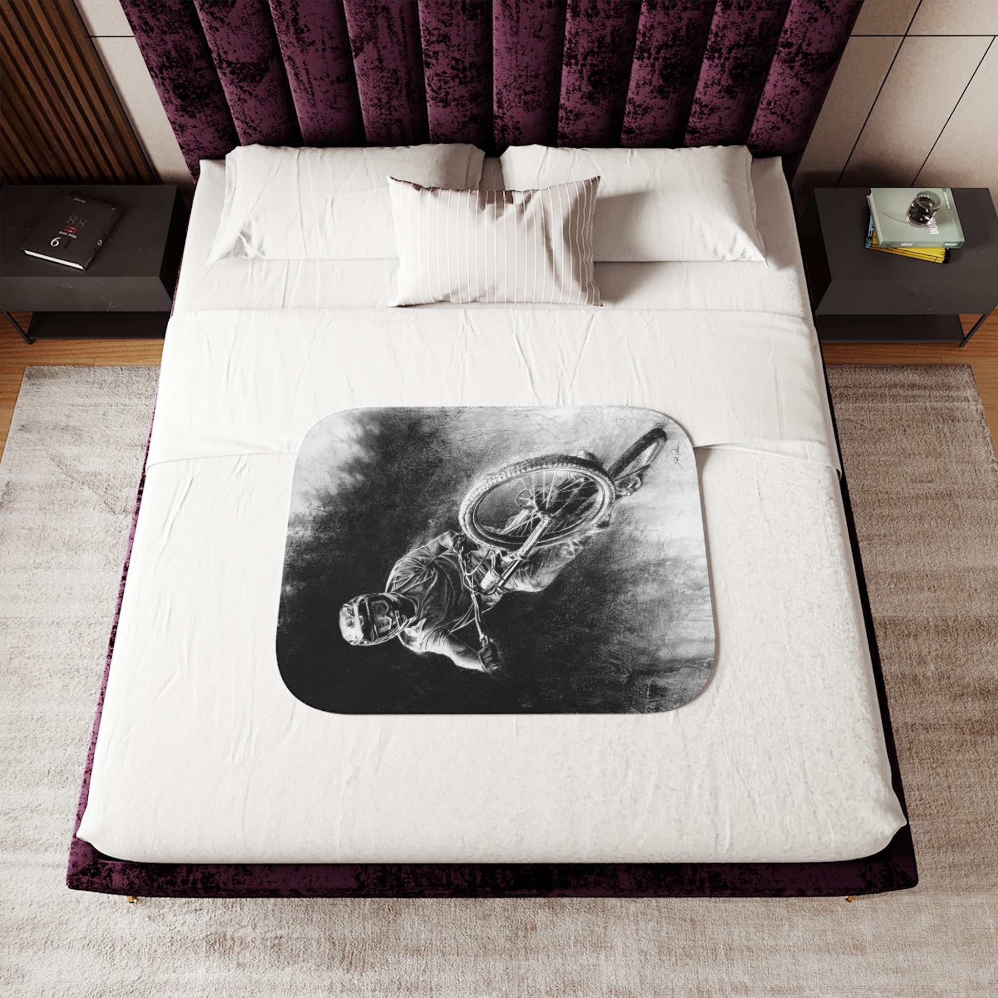 This snuggly sherpa blanket comes in beige or grey colors and features artwork by Joel Pilcher. Made with a supremely soft polyester front and a sherpa back, it's available in 3 sizes.