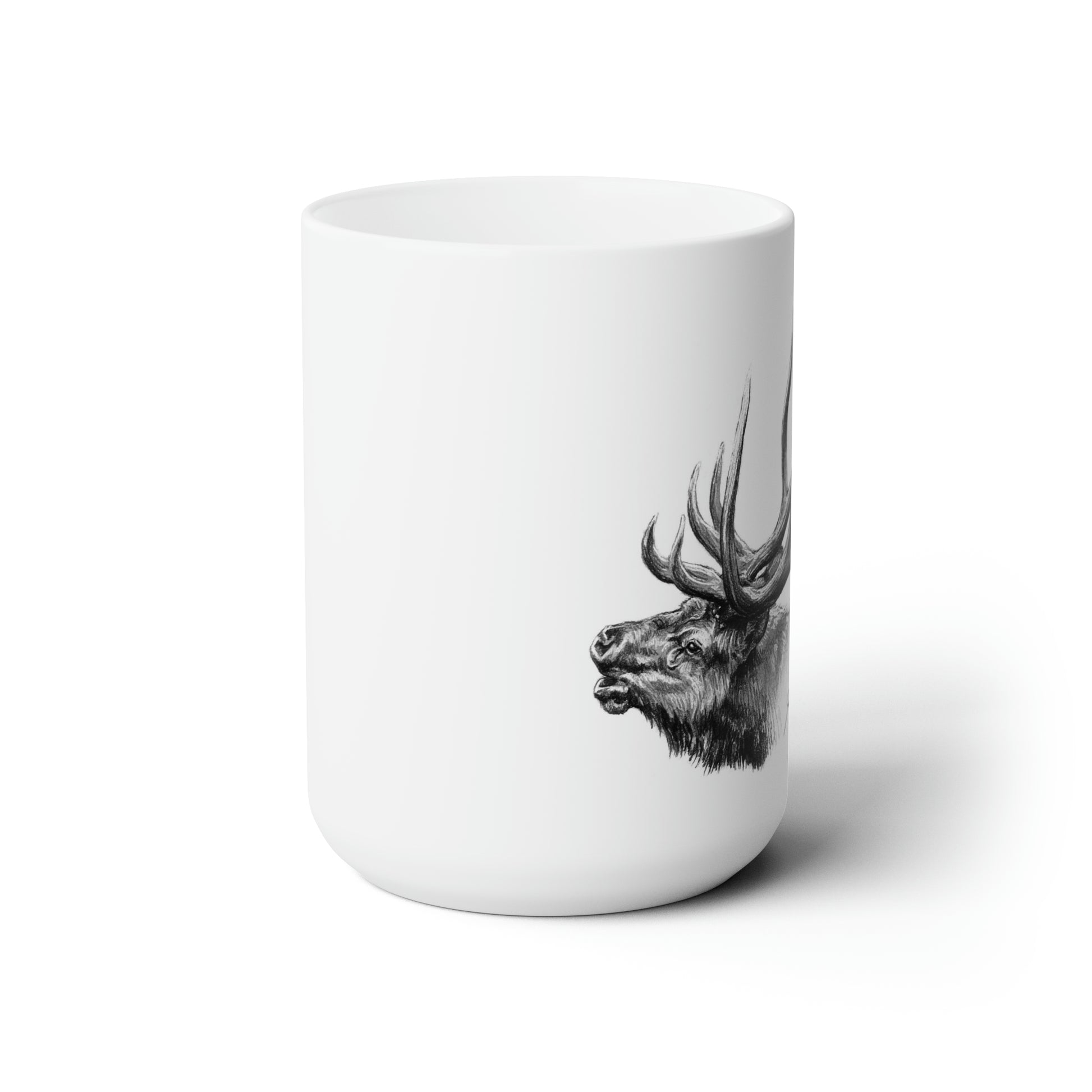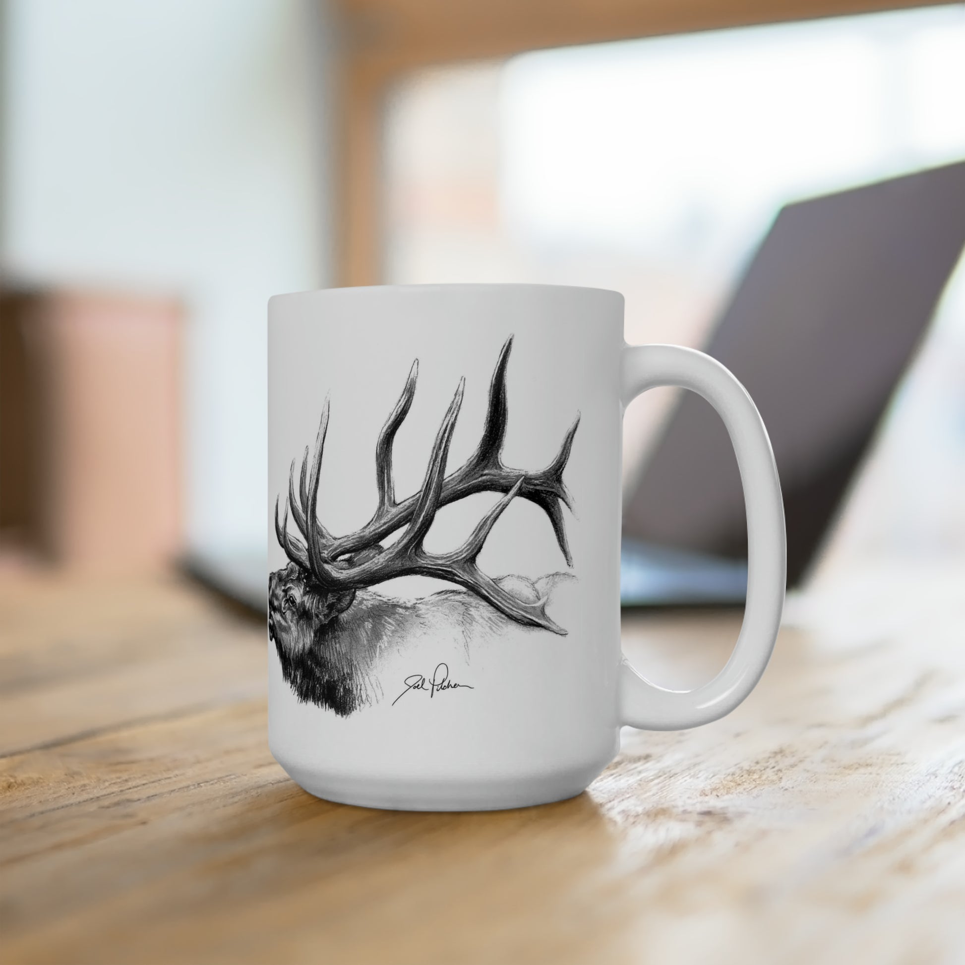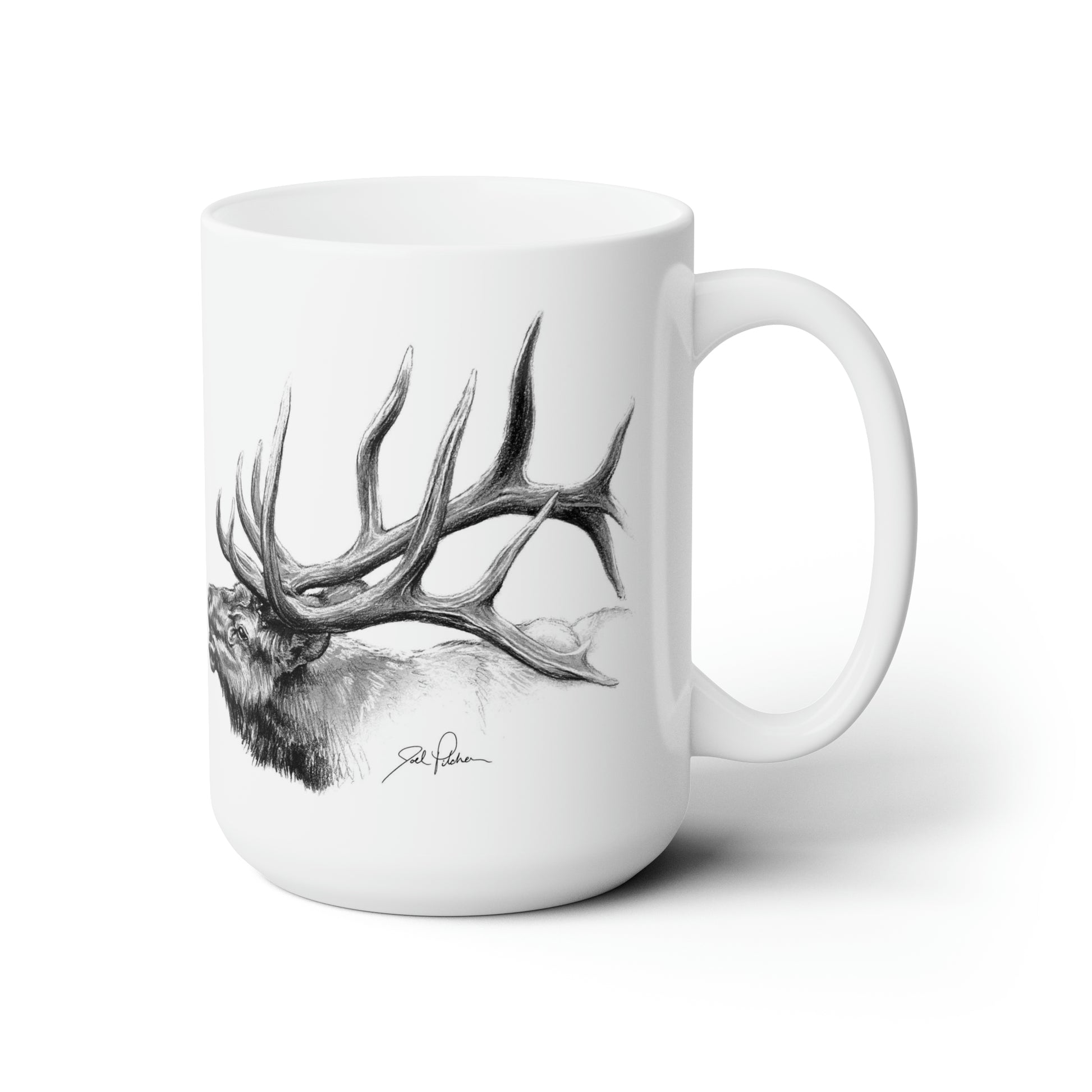 This 15 ounce mug features a bugling bull elk sketch by Joel Pilcher. It’s microwave-safe, and can be washed in dishwasher or easily cleaned with a mild detergent.