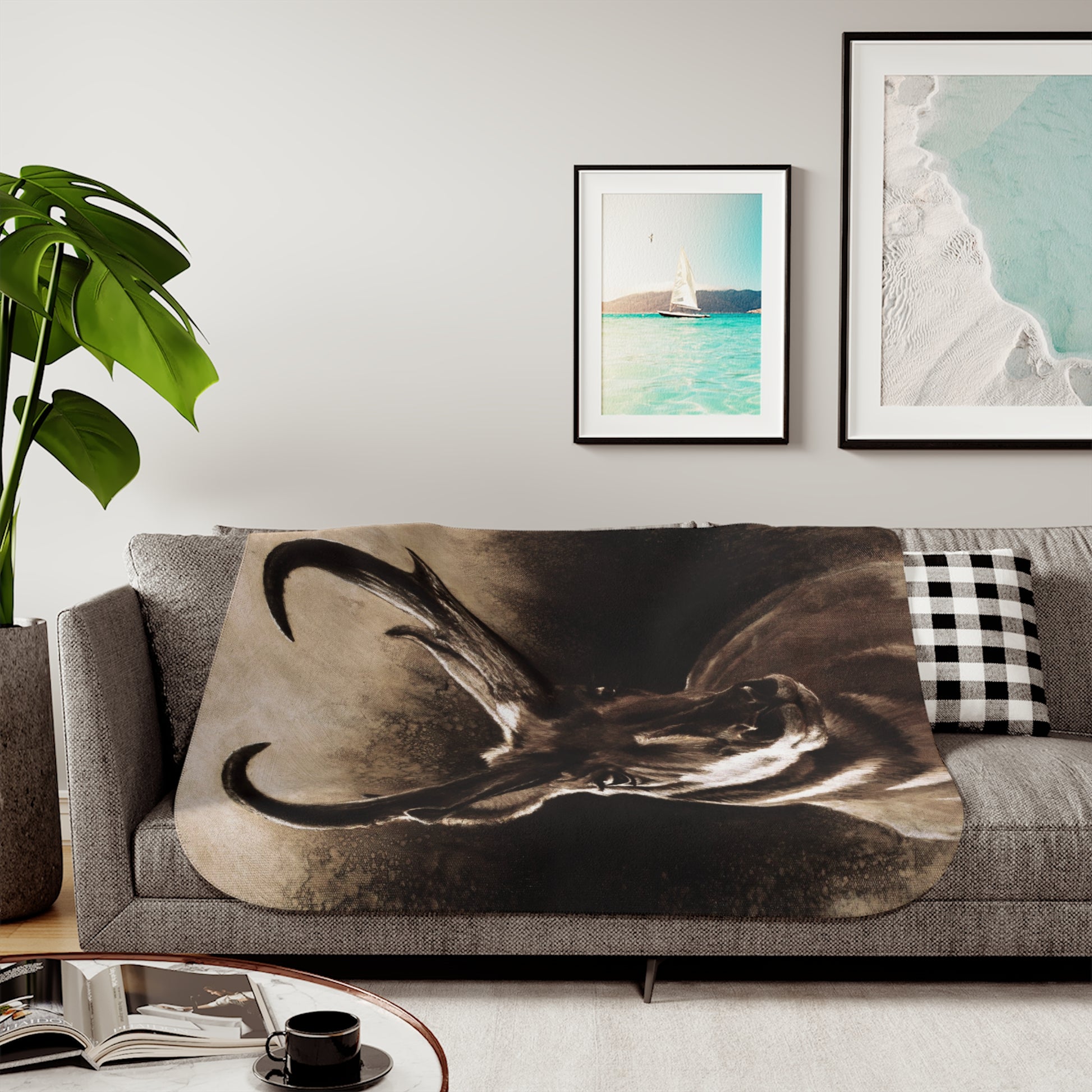 This snuggly sherpa blanket comes in beige or grey colors and features artwork by Joel Pilcher. Made with a supremely soft polyester front and a sherpa back, it's available in 3 sizes.