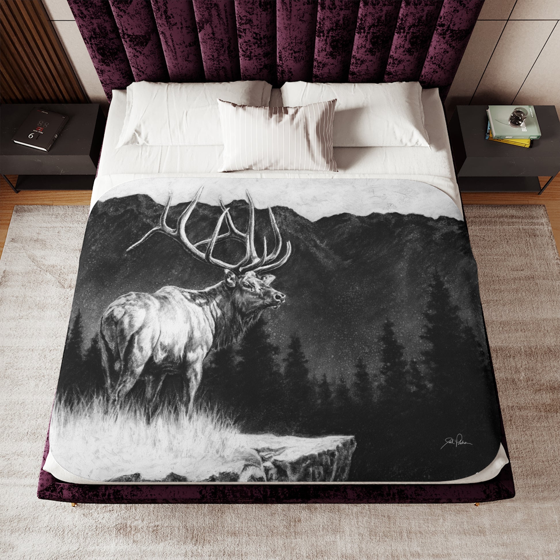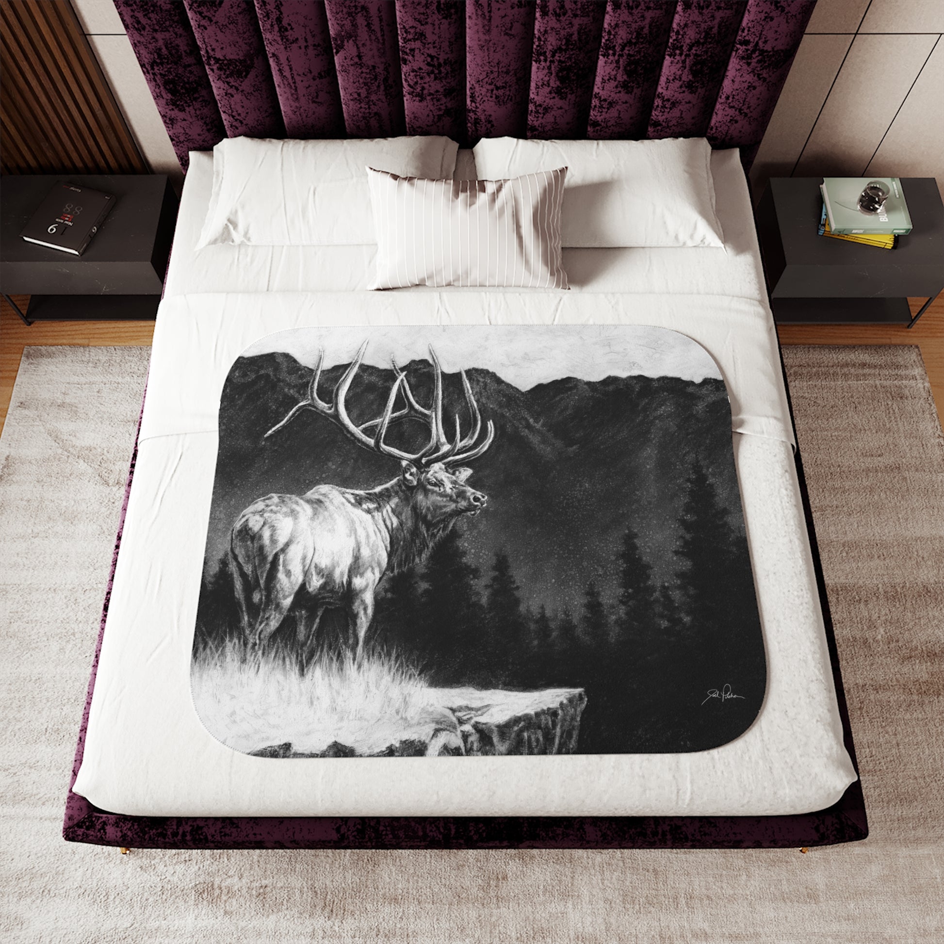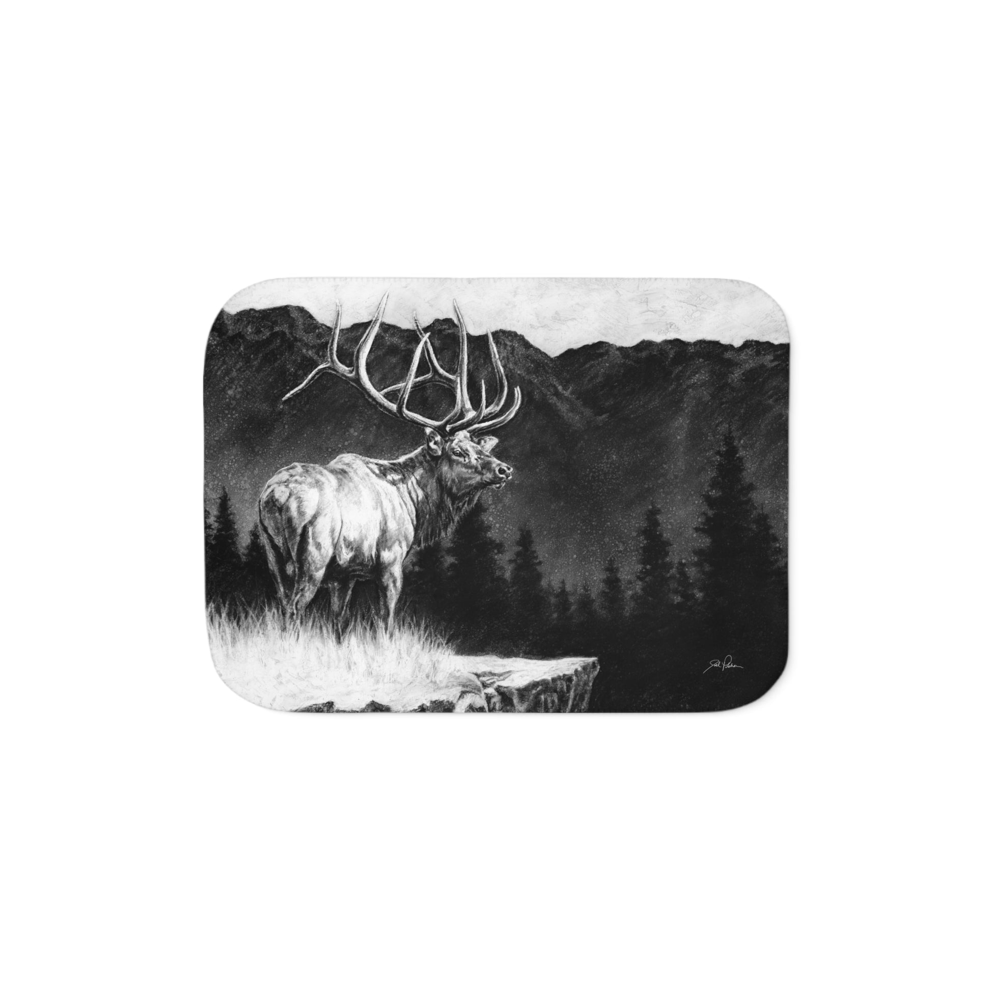 This snuggly sherpa blanket comes in beige or grey colors and features artwork by Joel Pilcher. Made with a supremely soft polyester front and a sherpa back, it's available in 3 sizes.