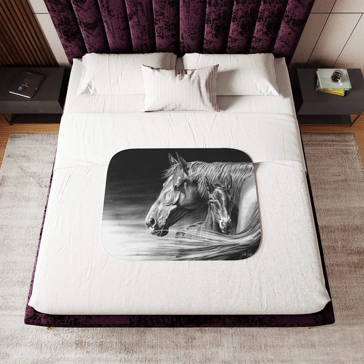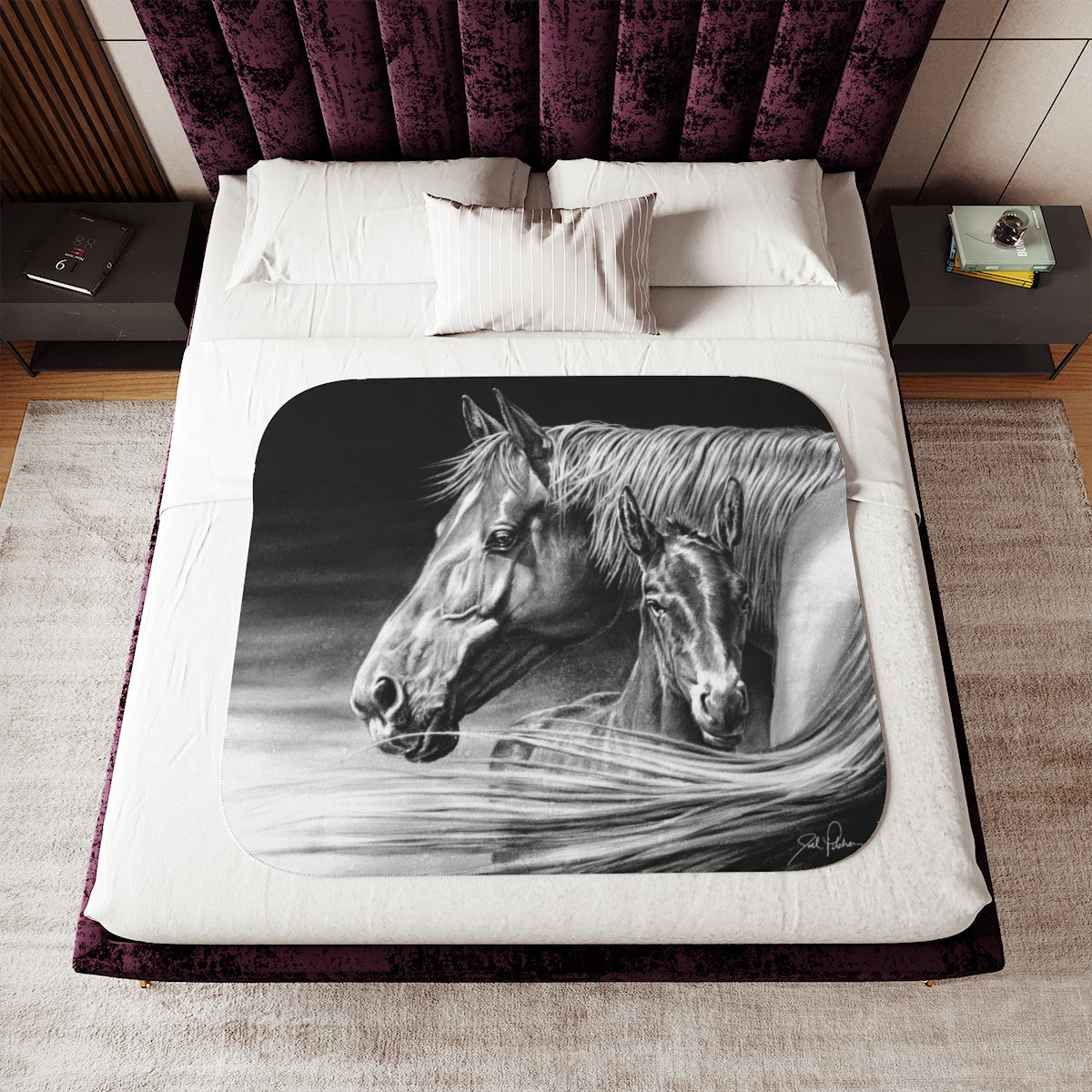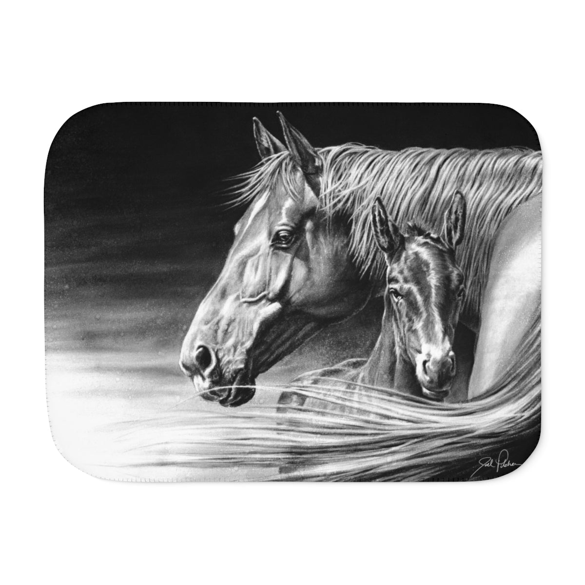 This snuggly sherpa blanket comes in beige or grey colors and features artwork by Joel Pilcher. Made with a supremely soft polyester front and a sherpa back, it's available in 3 sizes.