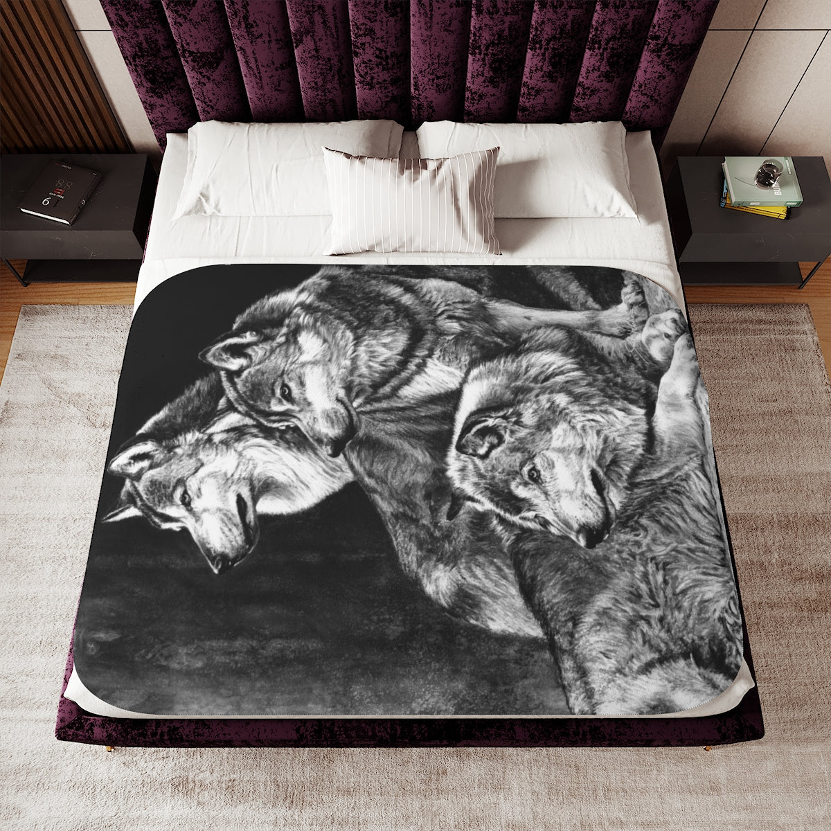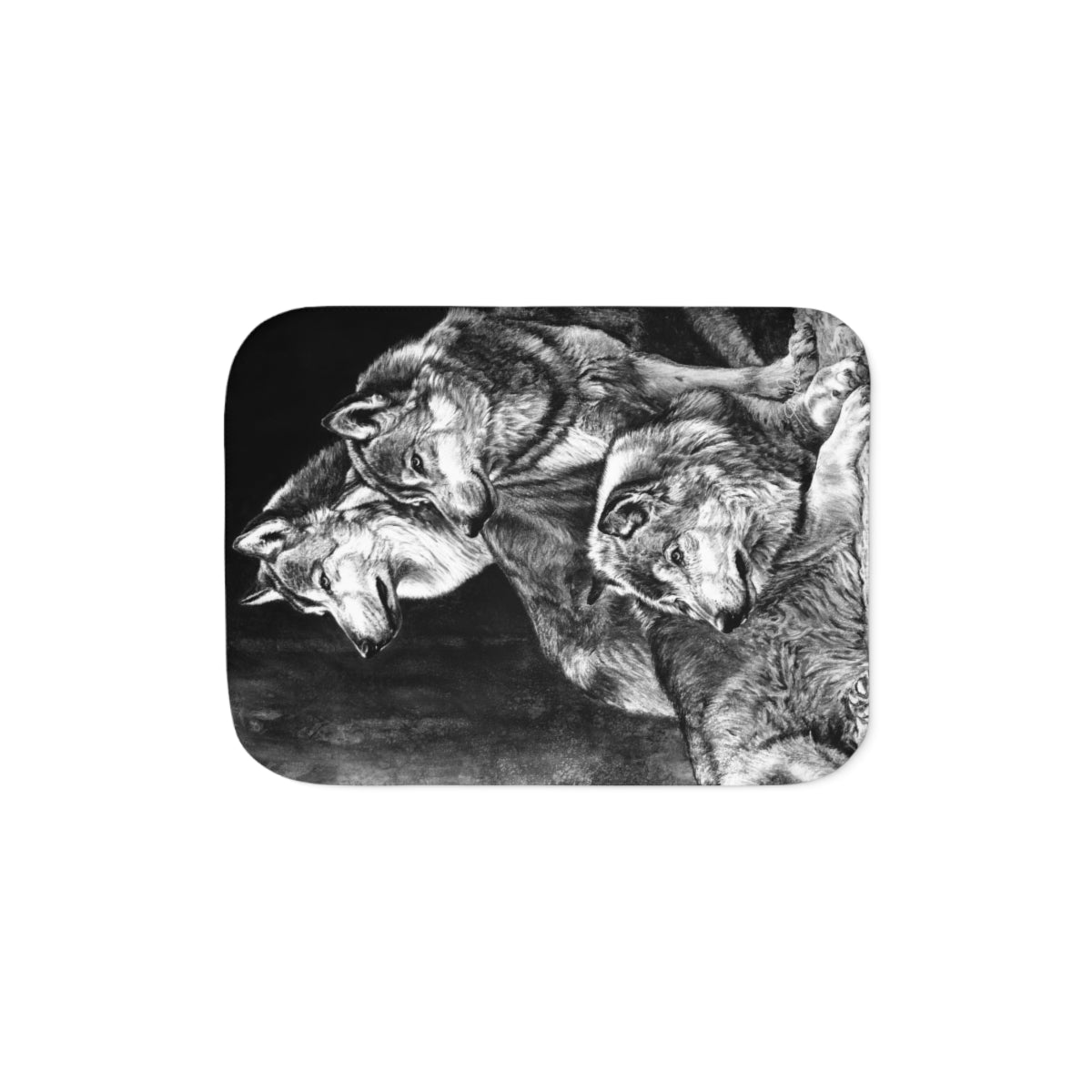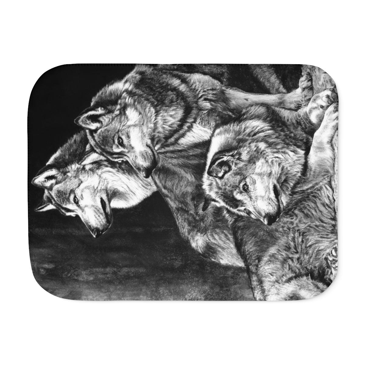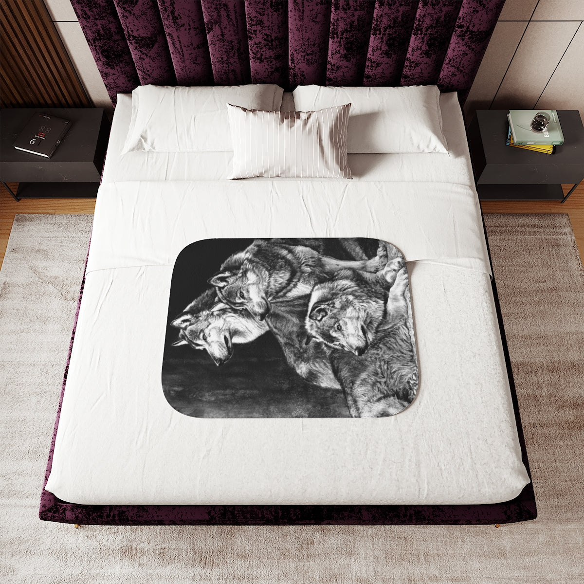 This snuggly sherpa blanket comes in beige or grey colors and features artwork by Joel Pilcher. Made with a supremely soft polyester front and a sherpa back, it's available in 3 sizes.