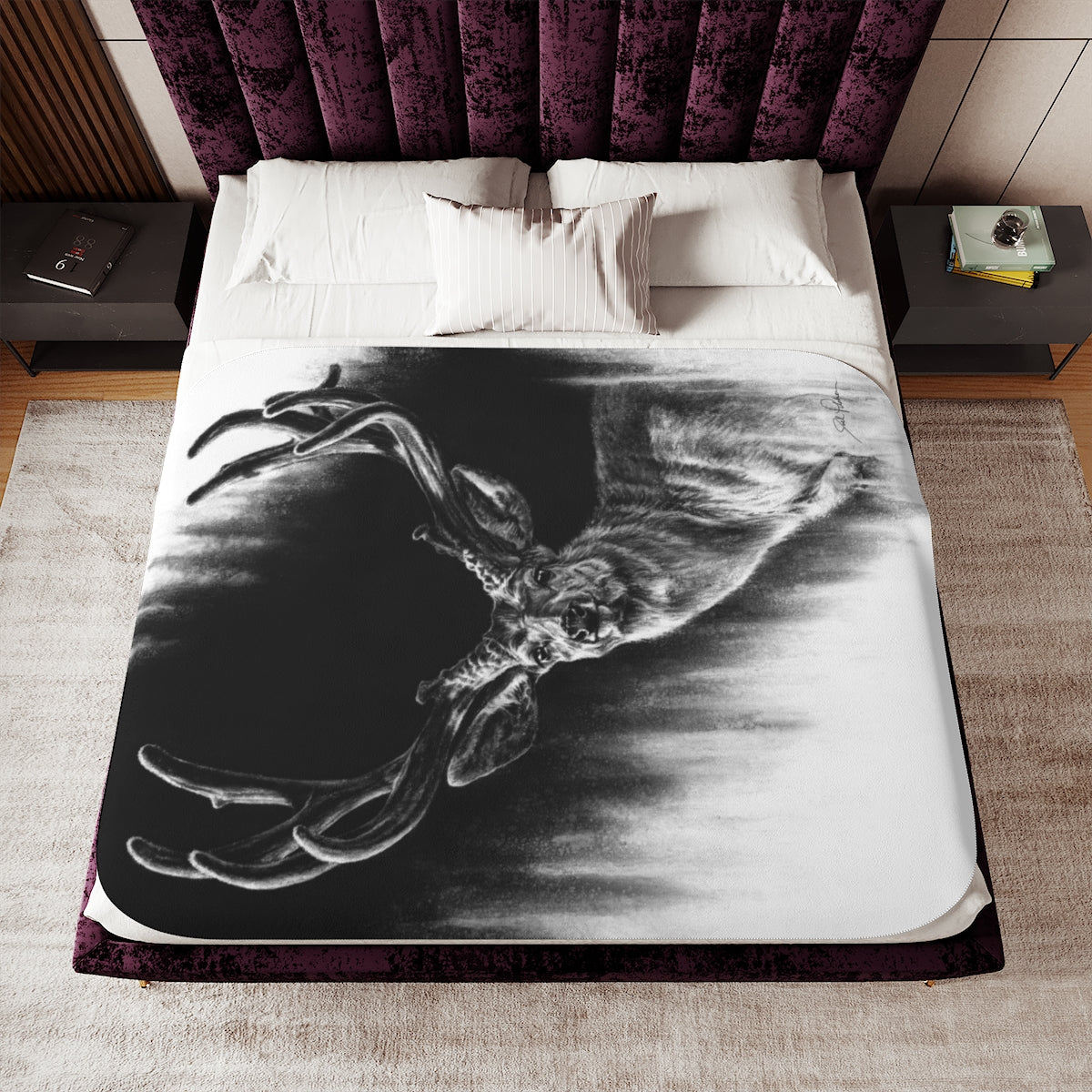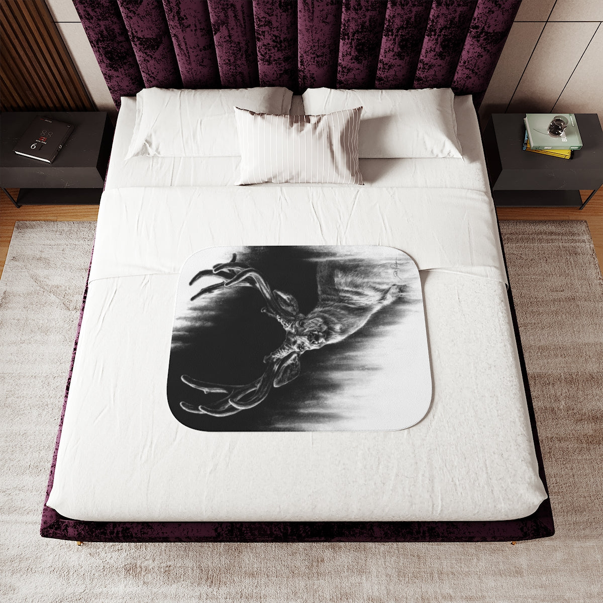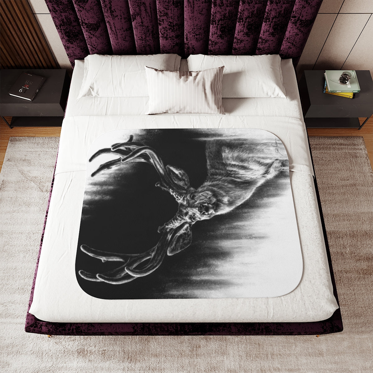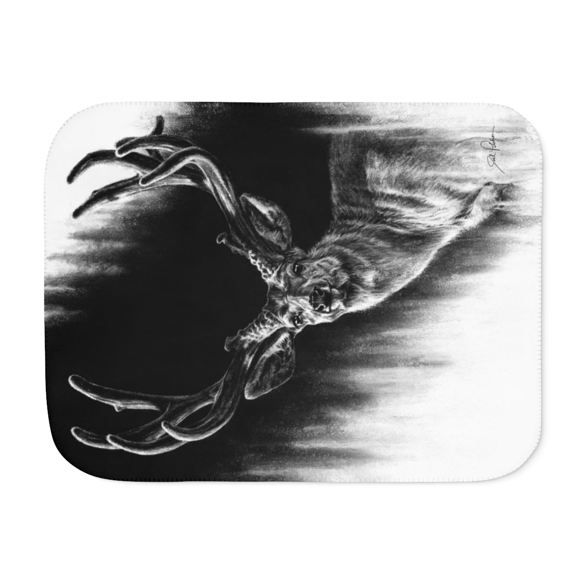 This snuggly sherpa blanket comes in beige or grey colors and features artwork by Joel Pilcher. Made with a supremely soft polyester front and a sherpa back, it's available in 3 sizes.