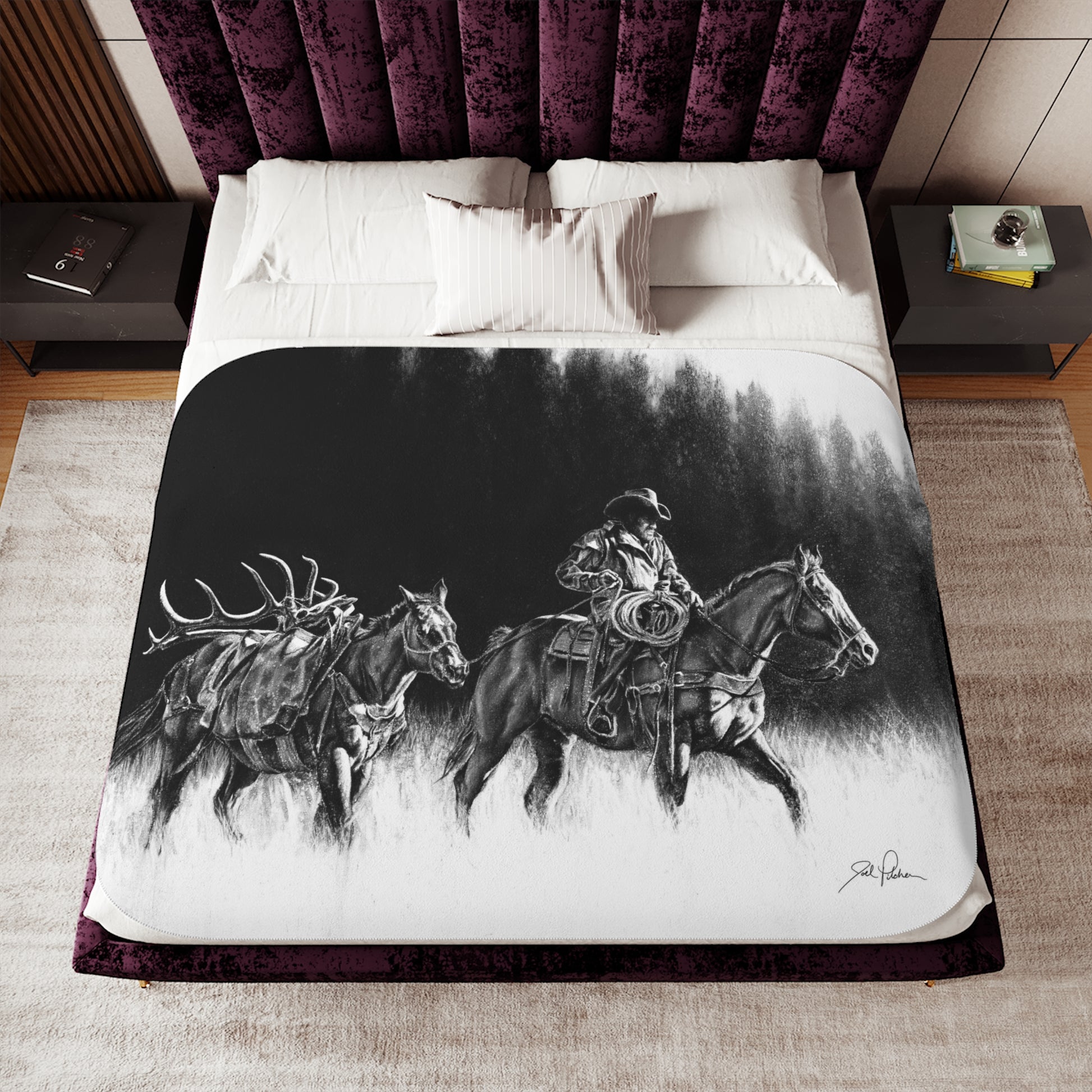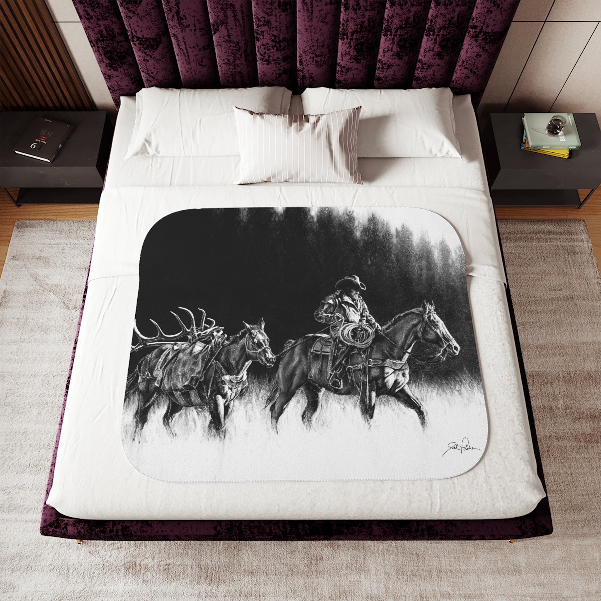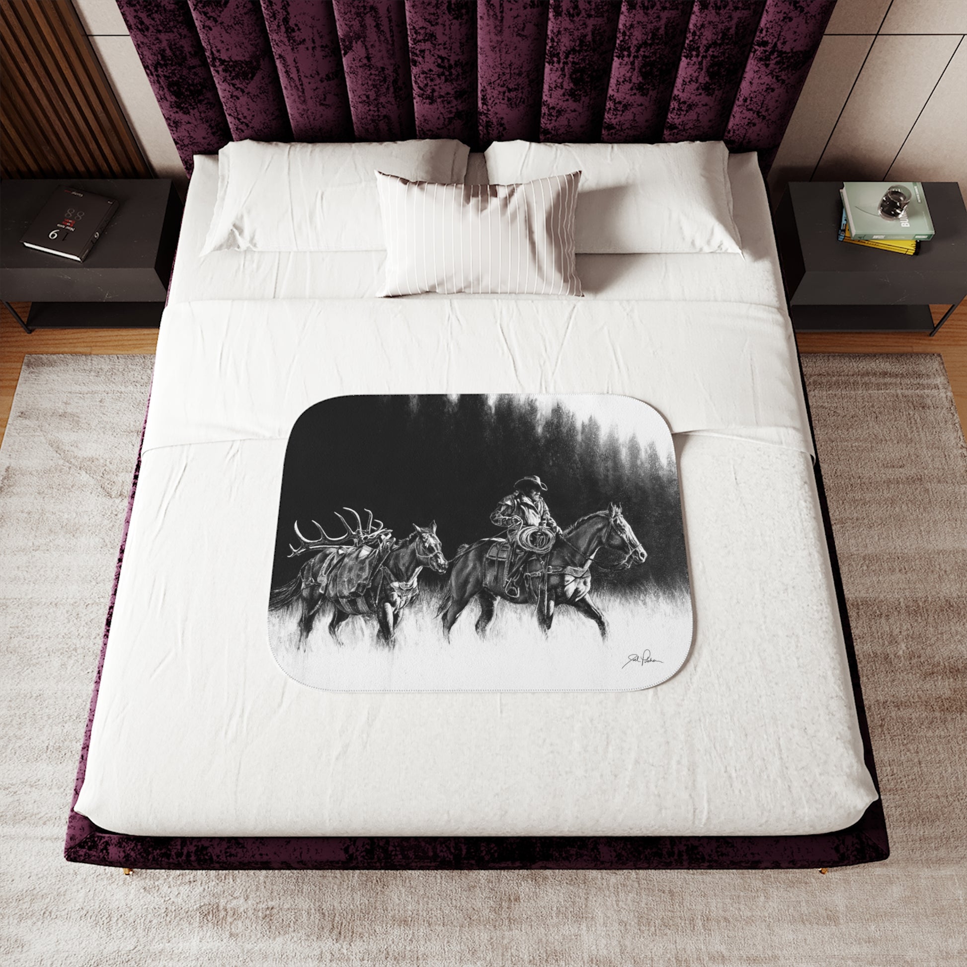 This snuggly sherpa blanket comes in beige or grey colors and features artwork by Joel Pilcher. Made with a supremely soft polyester front and a sherpa back, it's available in 3 sizes.