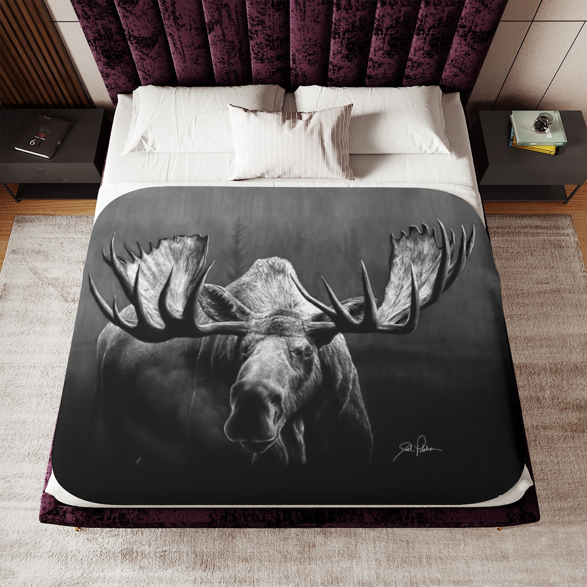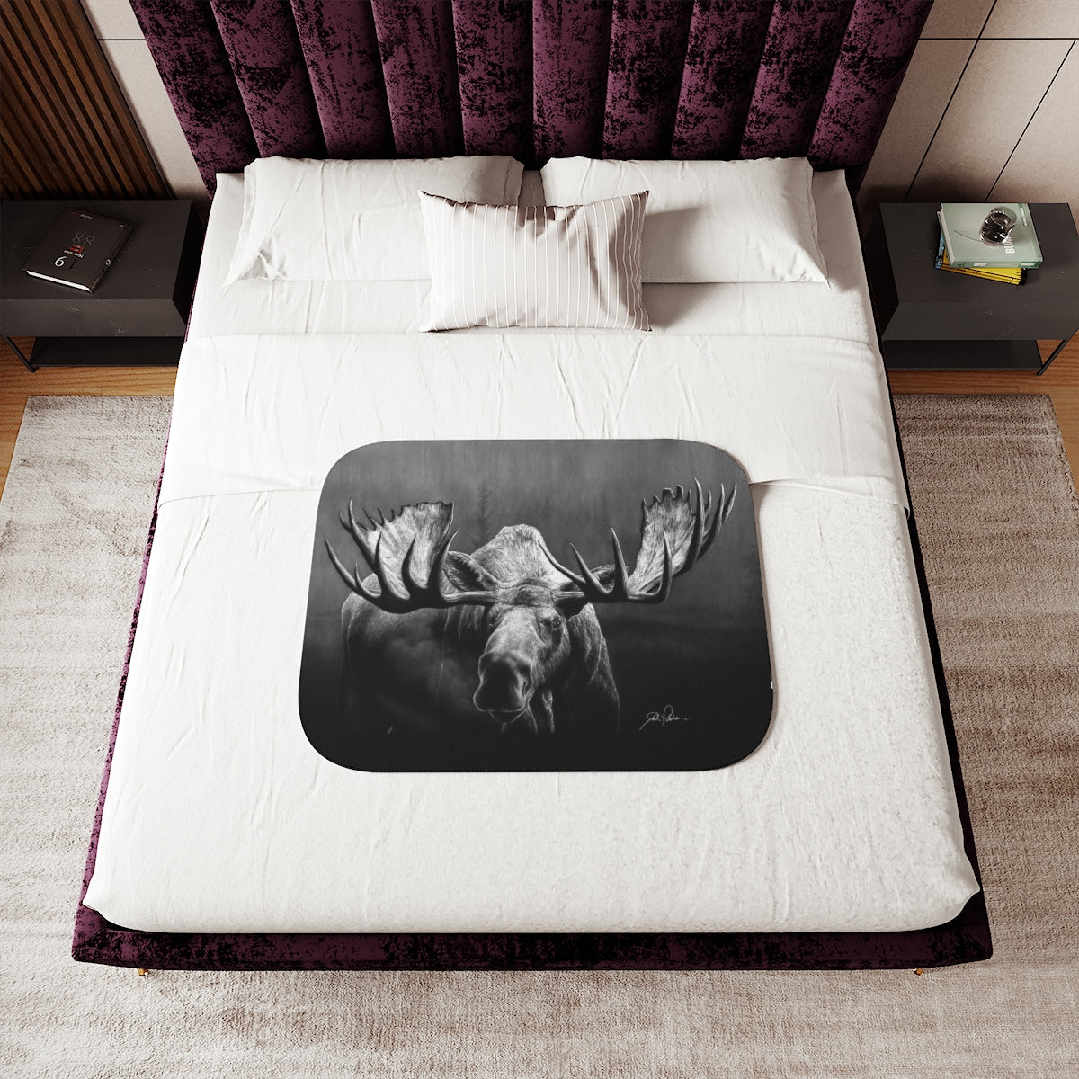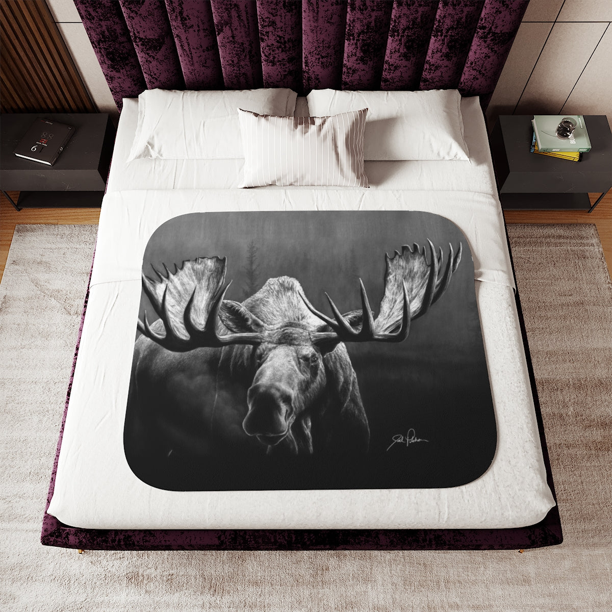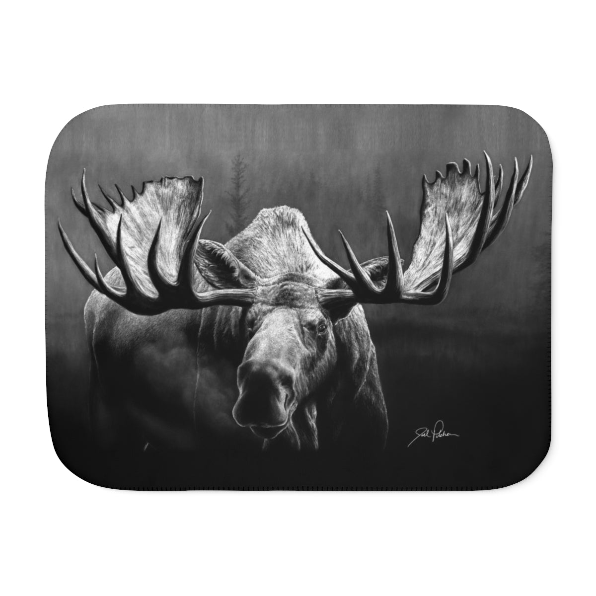 This snuggly sherpa blanket comes in beige or grey colors and features artwork by Joel Pilcher. Made with a supremely soft polyester front and a sherpa back, it's available in 3 sizes.